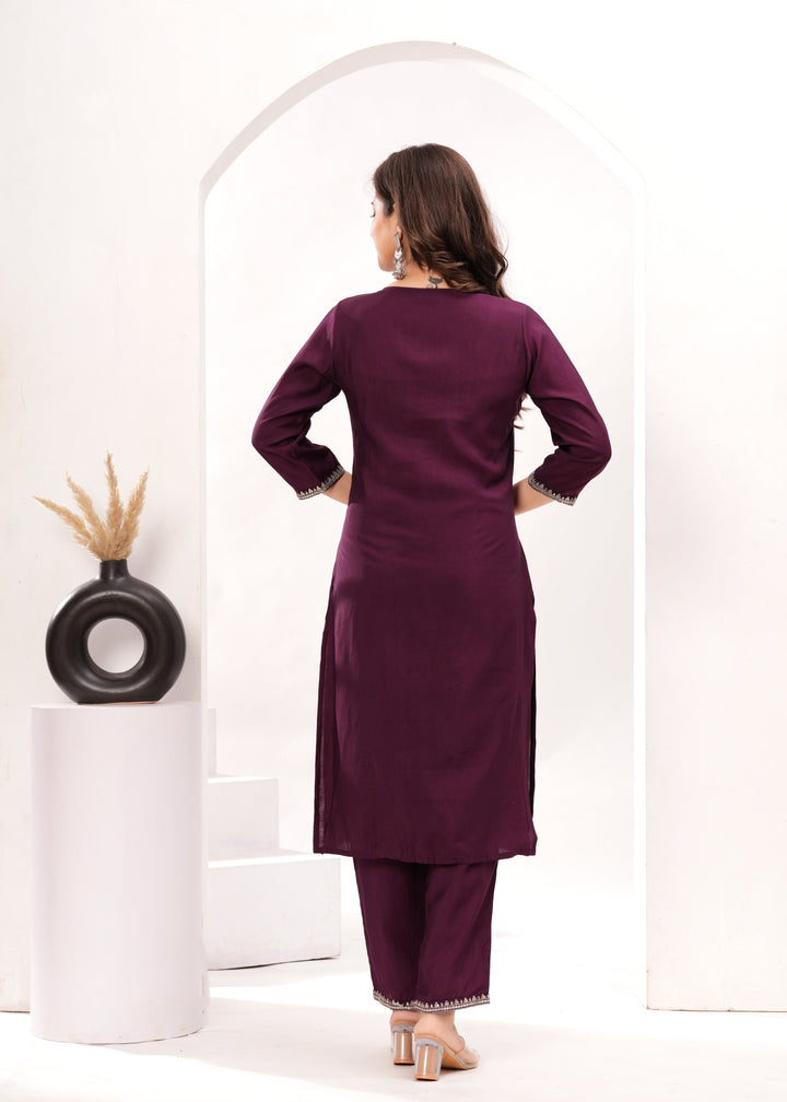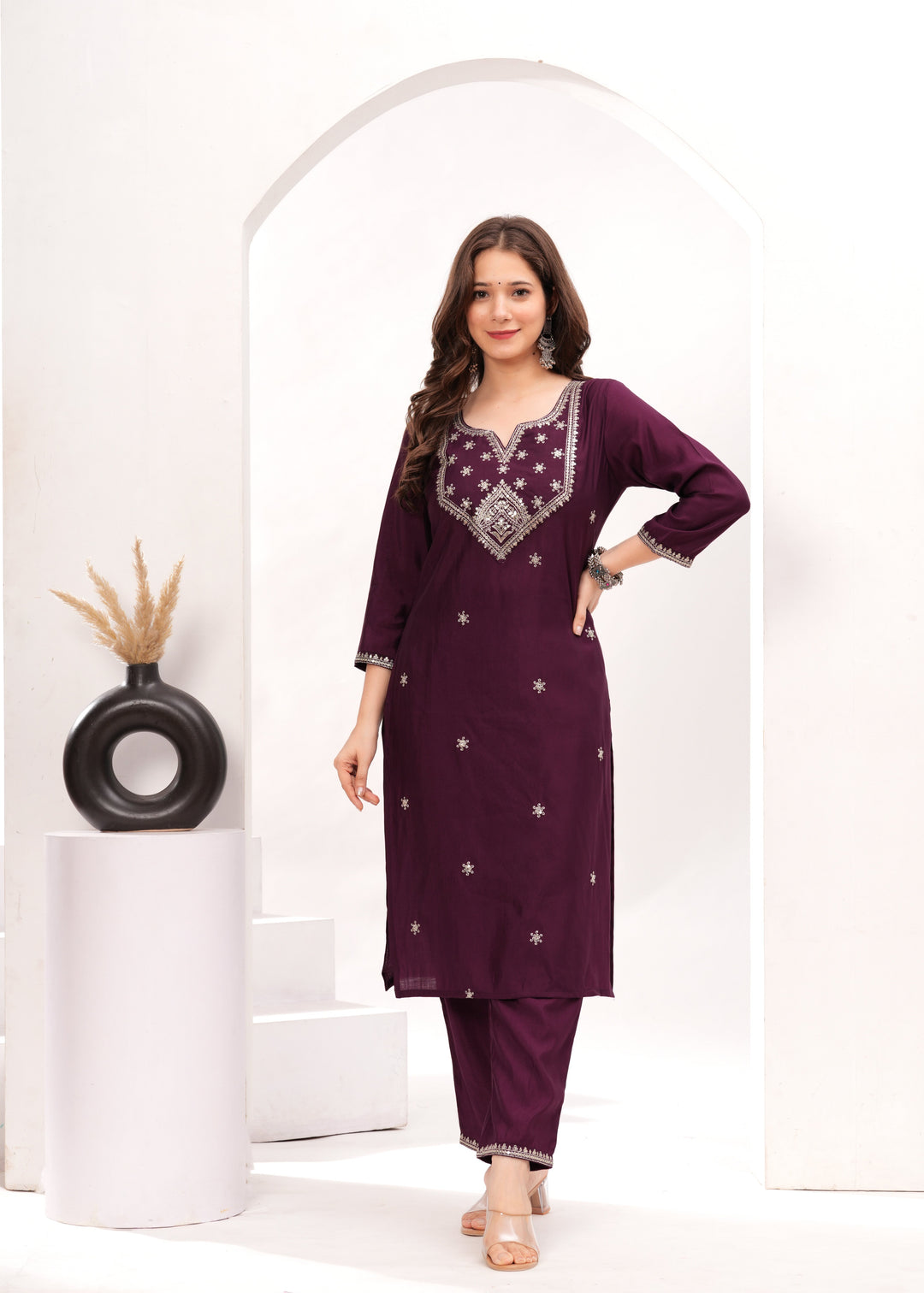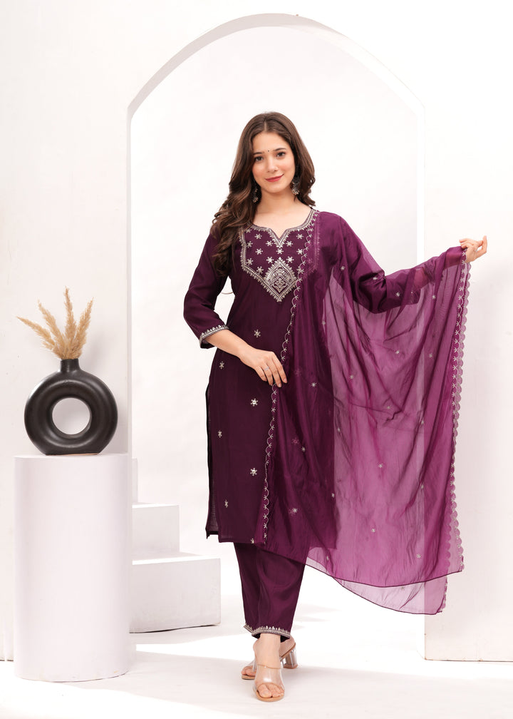 Step into timeless grace with this beautifully embroidered three-piece kurta set. The straight-cut kurta, featuring delicate embroidery on the neckline and hemline, pairs effortlessly with comfortable ankle-length trousers that come with a convenient pocket. The embroidered dupatta adds an extra layer of sophistication, making this set a must-have for any special occasion. Perfect for elegant soirées and festive moments!