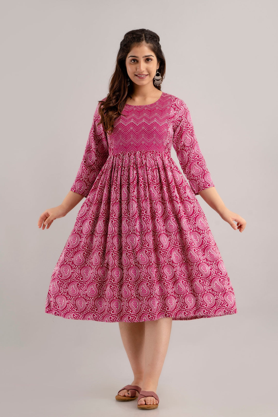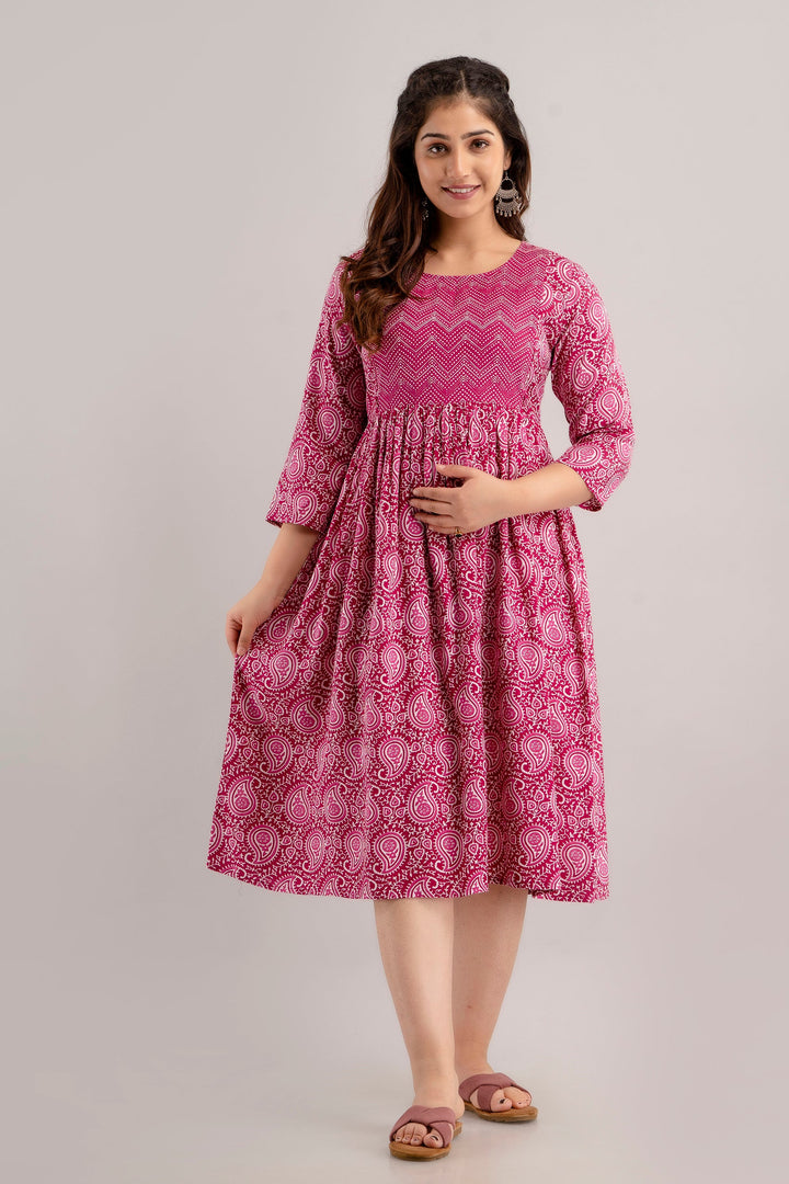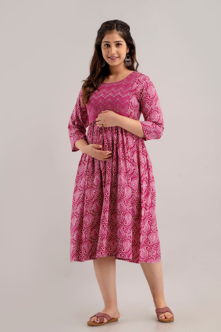 Brighten up your maternity wardrobe with this rani pink paisley-printed dress, crafted from lightweight rayon for a soft and flowy feel. Designed with a flattering flared silhouette, half sleeves, and hidden side zippers for easy breastfeeding access, this dress offers both style and functionality.