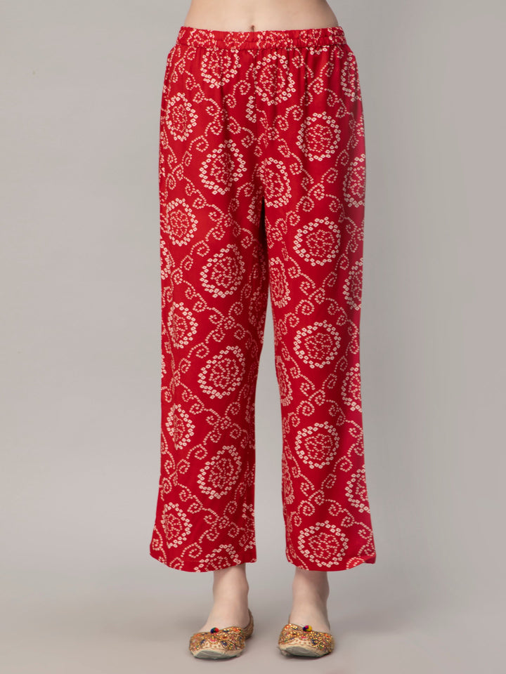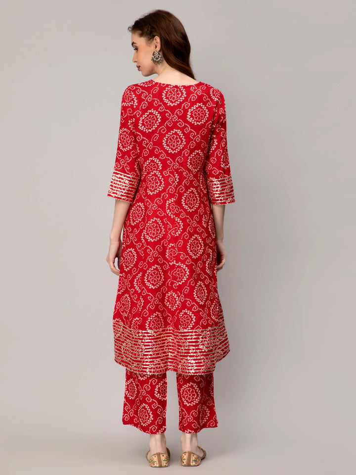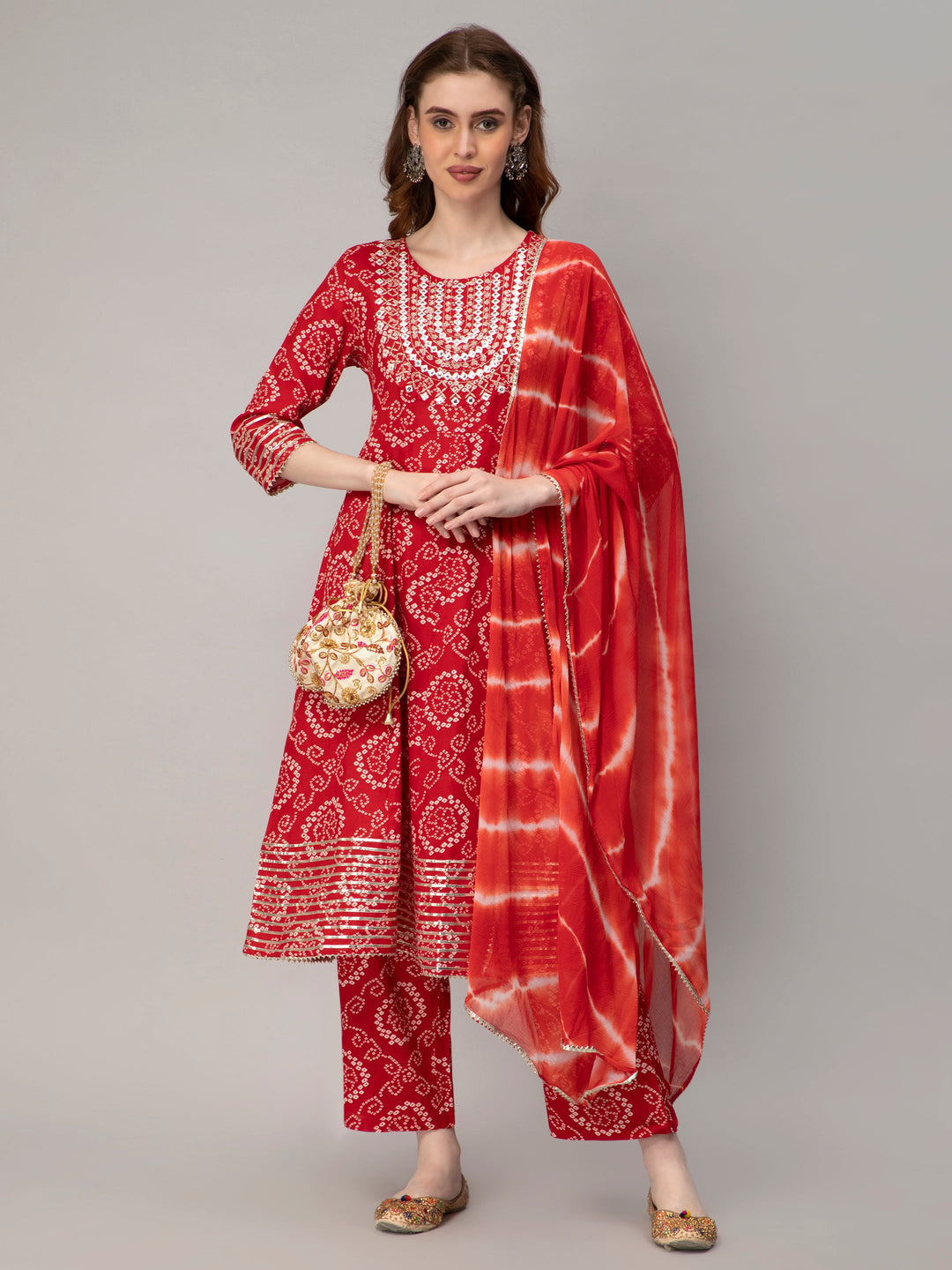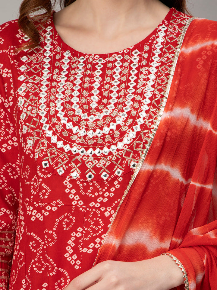 Make a statement with this stunning Bandhani-printed Anarkali kurta set, featuring intricate embroidery, Gotta Patti, and mirror work. The calf-length kurta is paired with matching printed pants and a gorgeous tie-dye dupatta, all crafted from 100% soft and breathable rayon. Perfect for a graceful summer look, this lightweight ensemble blends tradition with elegance effortlessly!