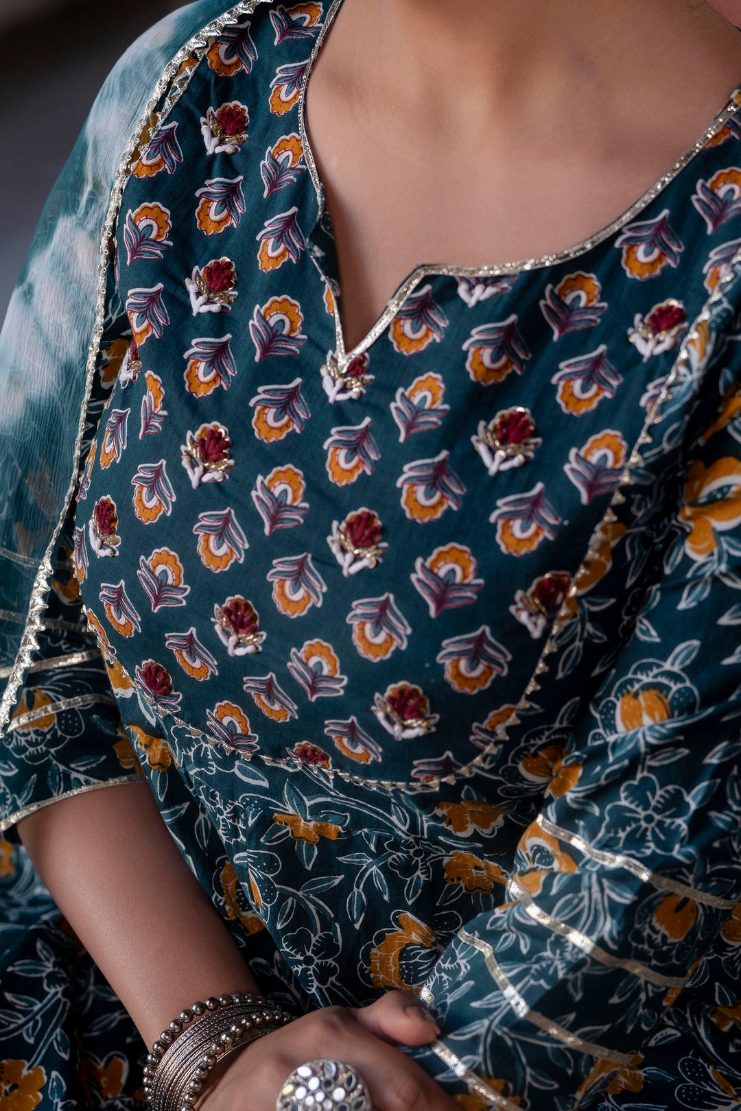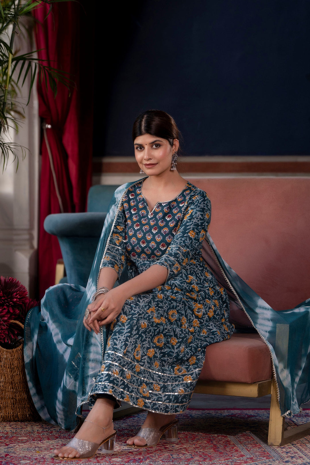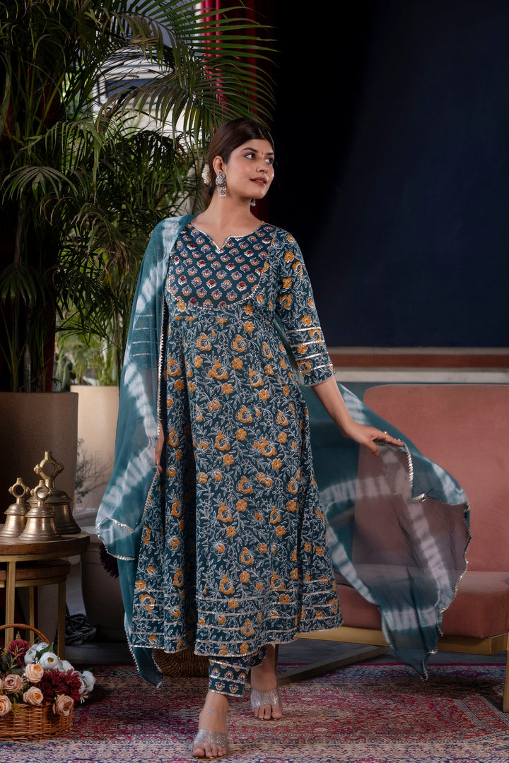 Make a statement with this elegant three-piece kurta set, featuring a floral-printed kurta and matching pants, paired with a beautifully crafted Shibori tie-dye dupatta. Made from soft and breathable cotton, the flared kurta offers a comfortable yet stylish fit, perfect for festive gatherings, casual outings, or everyday wear. A perfect blend of tradition and modern charm!