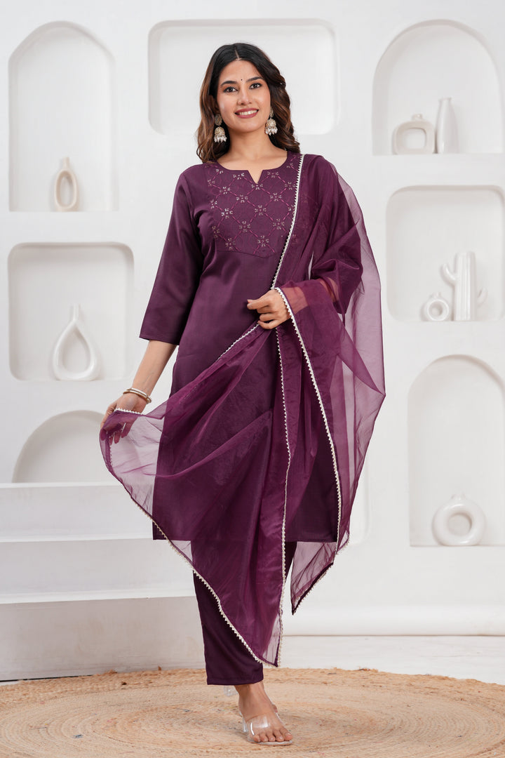 Step into effortless elegance with this 3-piece solid kurta set, designed for both comfort and sophistication. The straight-cut kurta features a minimalist yet refined look, crafted from a soft cotton blend for all-day ease. Paired with ankle-length trousers that include a functional pocket for added convenience, this ensemble is completed with a matching dupatta that enhances its graceful appeal. Perfect for work, festive gatherings, or casual outings, this set is a must-have in every wardrobe!