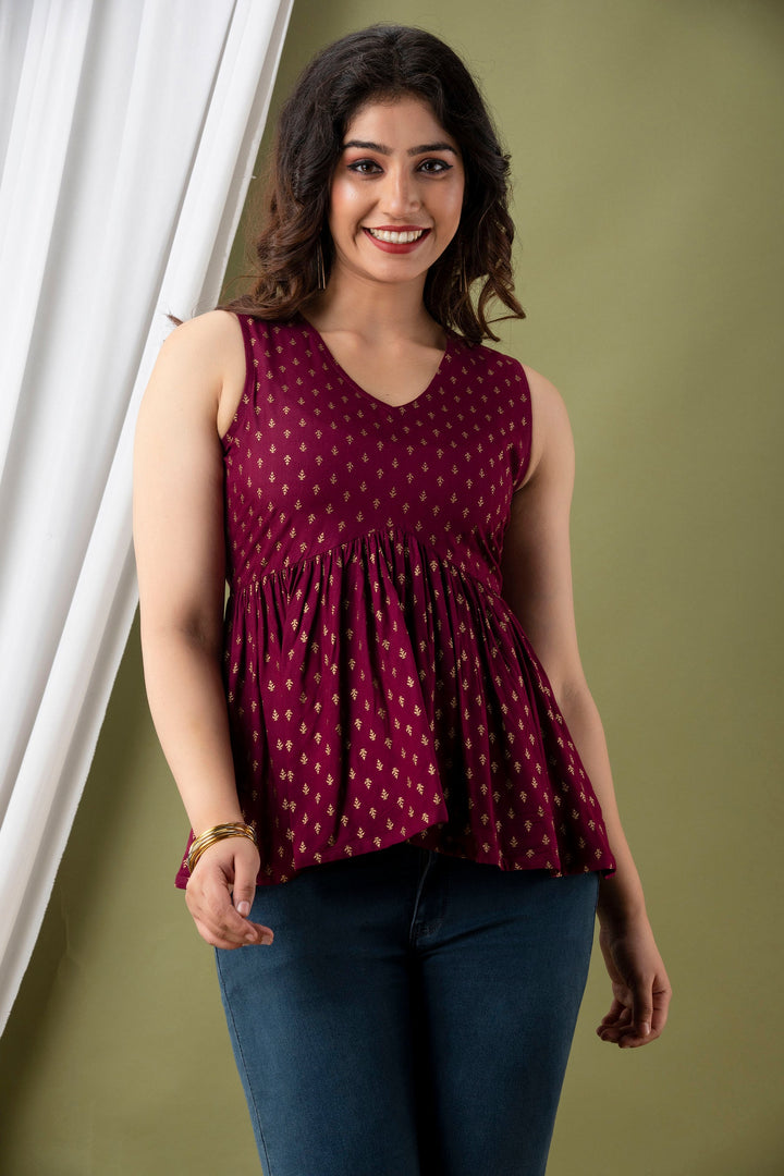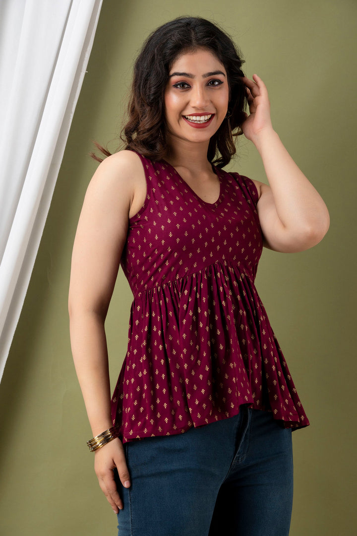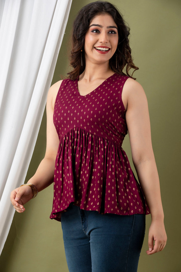 Add a touch of elegance to your casual wardrobe with this wine-colored flared top. Crafted from soft rayon fabric, it features a charming floral print and a sleeveless design, ensuring all-day comfort and effortless style!