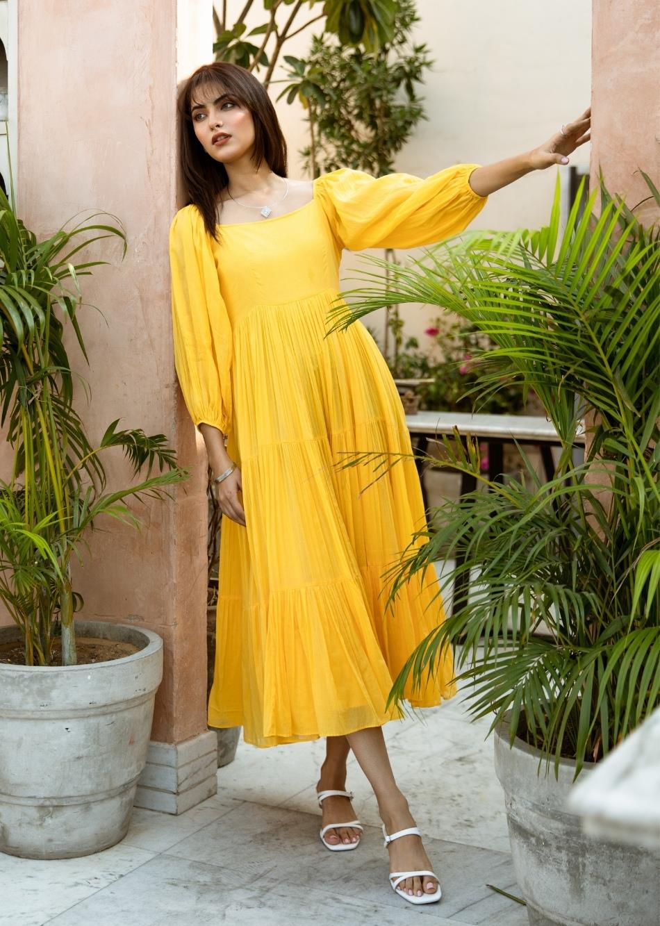 Heading to Grandma's house, rocking my fave yellow dress mid-calf, 3-tiered perfection, flowy and gathered, with balloon sleeves for that extra charm. Butterscotch pudding awaits, and so does the comfort of home. Life's sweet in yellow and Grandma's hugs!