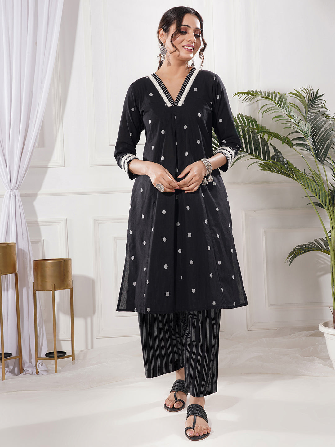 Elegant And Easy To Style, This Black Cotton Kurta Is Designed In A Flattering A-Line Silhouette. The V-Neckline And 3/4 Sleeves Are Complemented With Subtle Lace Work, Adding A Graceful Finish. Functional Side Pockets Enhance Everyday Comfort, Making It Perfect For Both Work And Casual Ethnic Wear. Includes: Kurta Details: Cotton Fabric, A-Line Fit, V-Neck, 3/4 Sleeves, Lace Work, Side Pockets