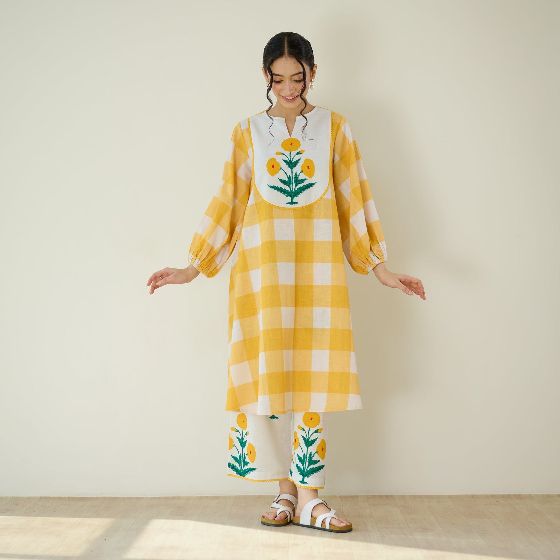 The Old School Slub Cotton Kurta Set in Mango Yellow captures timeless grace with a vibrant twist. Crafted from breathable slub cotton, the A-line kurta showcases a checkered print and a Sanganeri-inspired floral yoke that adds artistic charm. Balloon sleeves enhance its soft elegance, while side pockets offer everyday practicality. The coordinated wide-leg pants with lace detailing complete this set, making it perfect for relaxed gatherings or day outings.