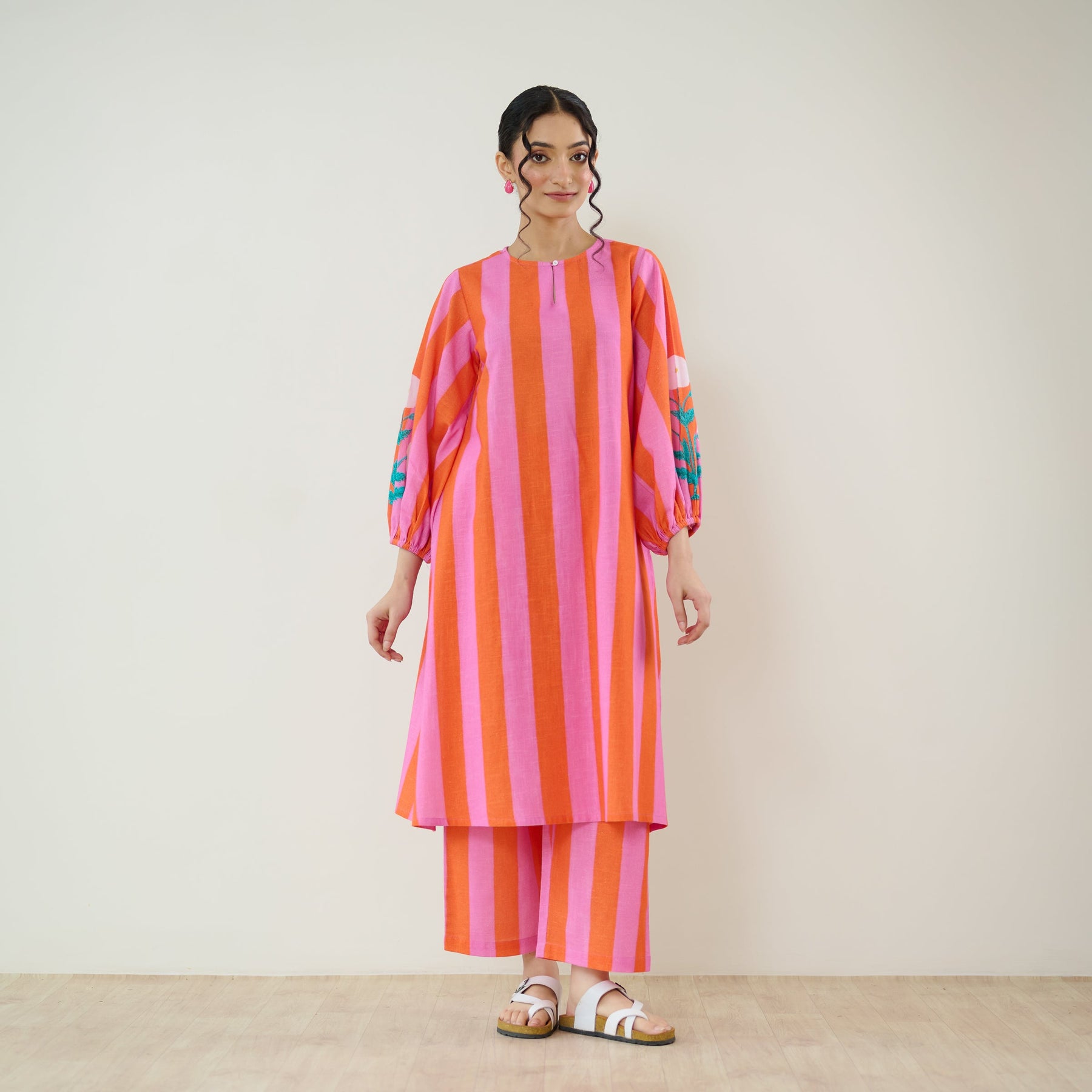 Bright, bold, and feminine, the Verandah Striped Kurta Set brings playful charm to everyday dressing. Crafted from pure slub cotton, it ensures breathable comfort with a textured touch. The relaxed A-line kurta features a keyhole neckline with a delicate shell button and side slits for graceful movement. Vertical stripes run through the silhouette, while balloon sleeves add soft volume highlighted with Sanganeri-inspired buta motifs. Functional side pockets add everyday ease. Paired with matching vertical-print pants, this set flatters with effortless vibrance.