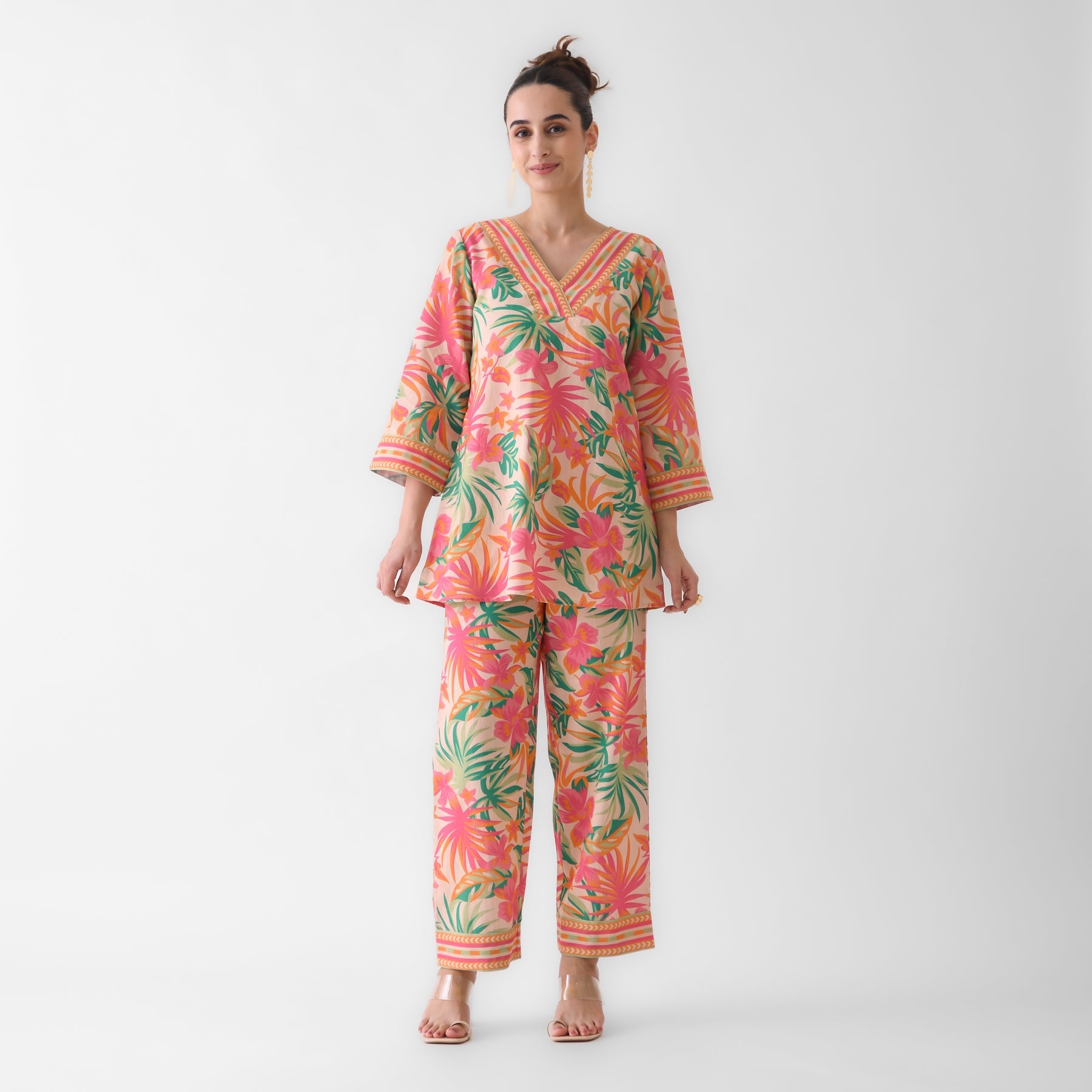 Stay cool and stylish with this tropical-printed cotton co-ord set, designed for everyday ease and chic appeal. The vibrant tropical motifs bring a splash of color to your wardrobe, while the coordinated top and bottom create a polished look that’s perfect for both casual and special occasions.