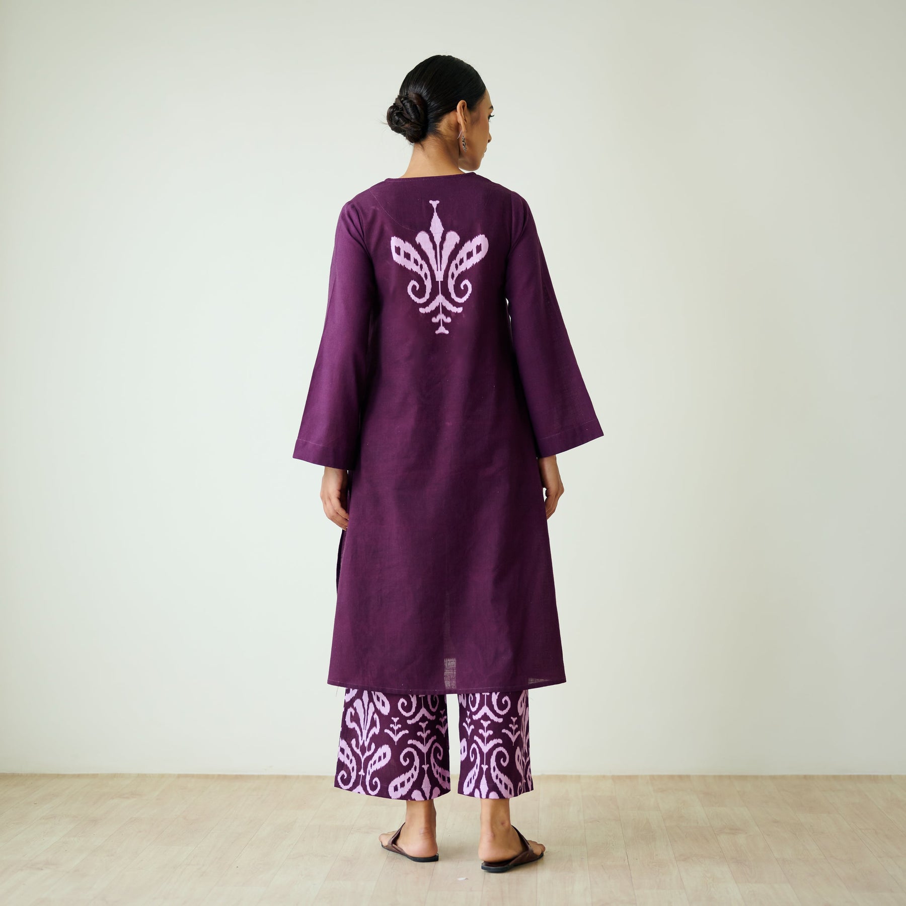 Traditional craft meets effortless elegance in the Resha Slub Cotton Kurta Set, a minimal silhouette brought to life with contemporary detail. Crafted from pure slub cotton, it ensures breathable comfort throughout the day. The kurta features a relaxed A-line fit with soft flared sleeves and side slits for easy movement. Monochrome Ikat-inspired motifs along the neckline add a refined touch of tradition, while hand-embroidered Mukaish work on the yoke introduces subtle shimmer and artisanal charm. Functional side pockets add practicality. Paired with matching trousers featuring coordinated Ikat-inspired prints, this set blends timeless grace with handcrafted finesse.