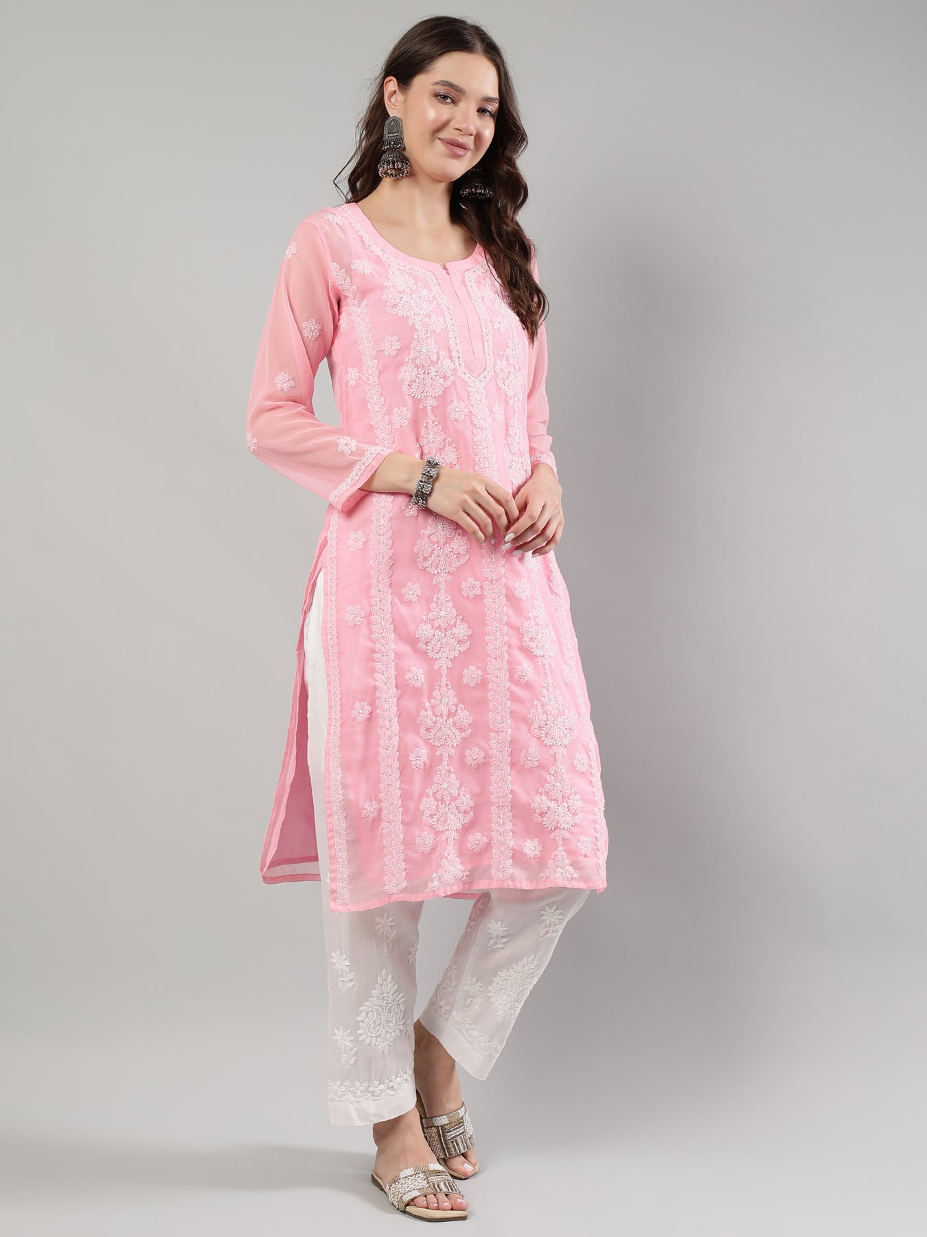 An elegant pink chikan kurti crafted in lightweight georgette, adorned with rich beige Ghaspatti and Phanda embroidery for a graceful ethnic look.