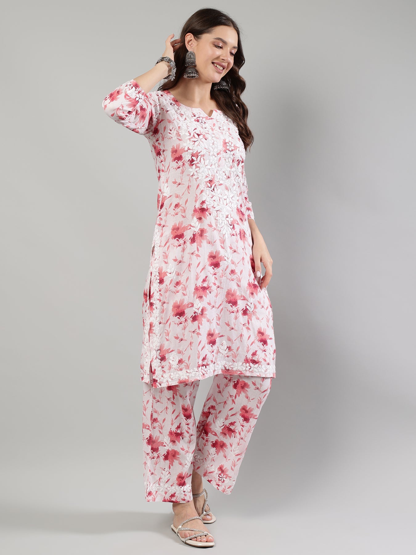 An elegant white chikan kurti crafted in soft cotton, enhanced with striking red Ghaspatti and Phanda embroidery for a vibrant ethnic look.