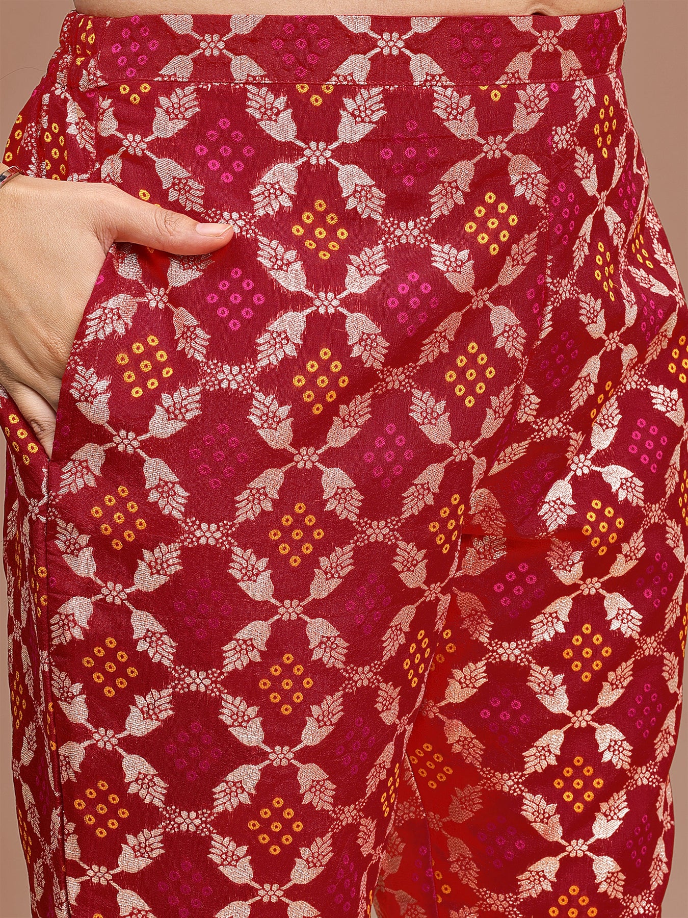 Stand Out In This Red Chanderi Co-Ord Set Featuring An Off-Shoulder Top Paired With Luxurious Brocade Pants. The Blend Of Rich Texture And Modern Design Makes It A Perfect Pick For Festive Occasions Or Evening Gatherings.