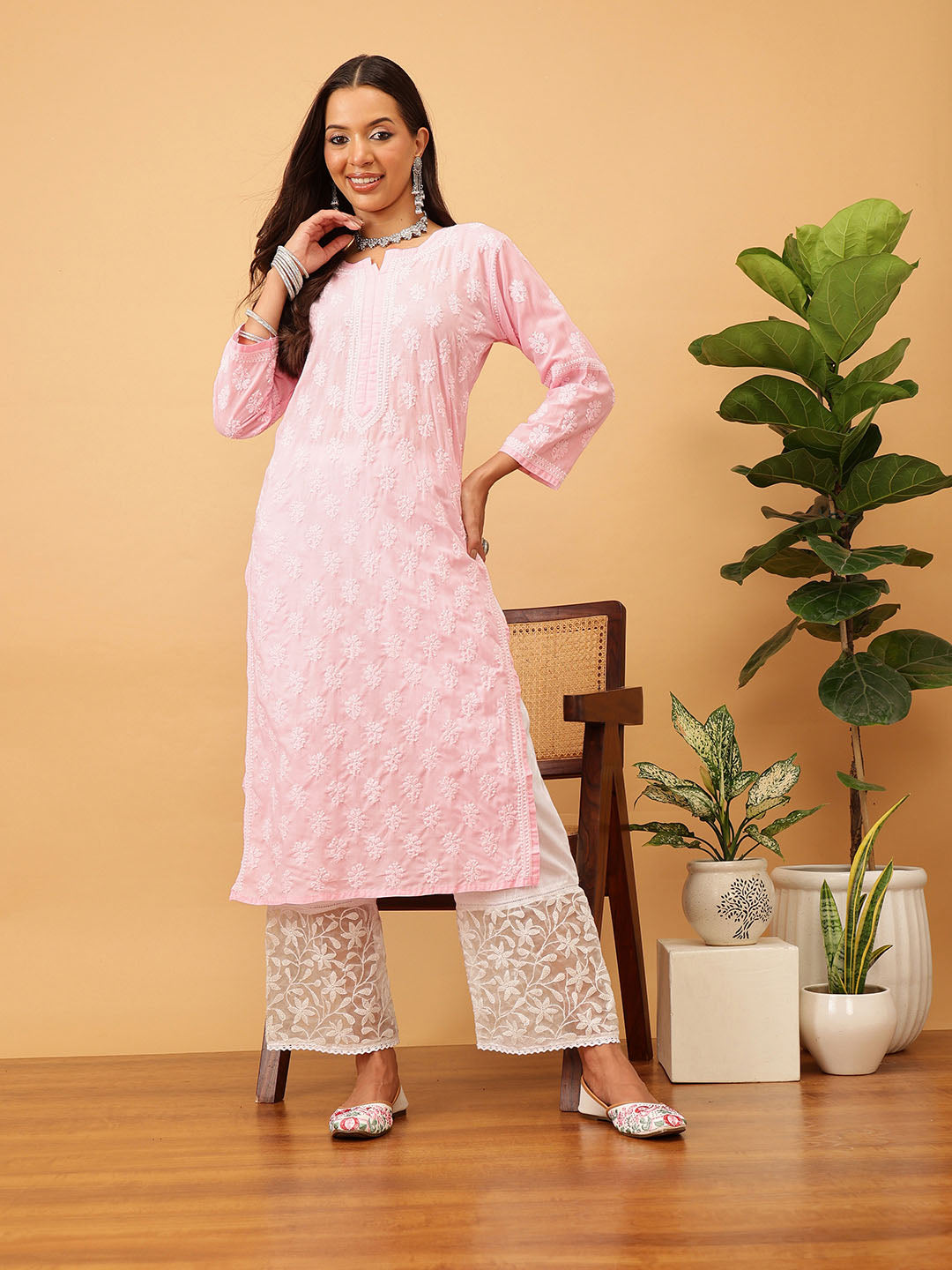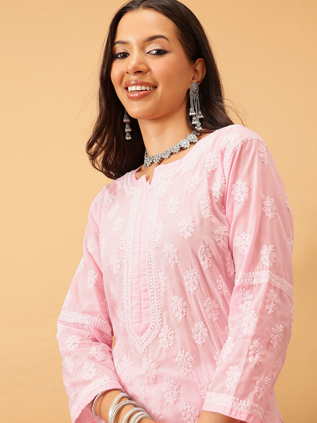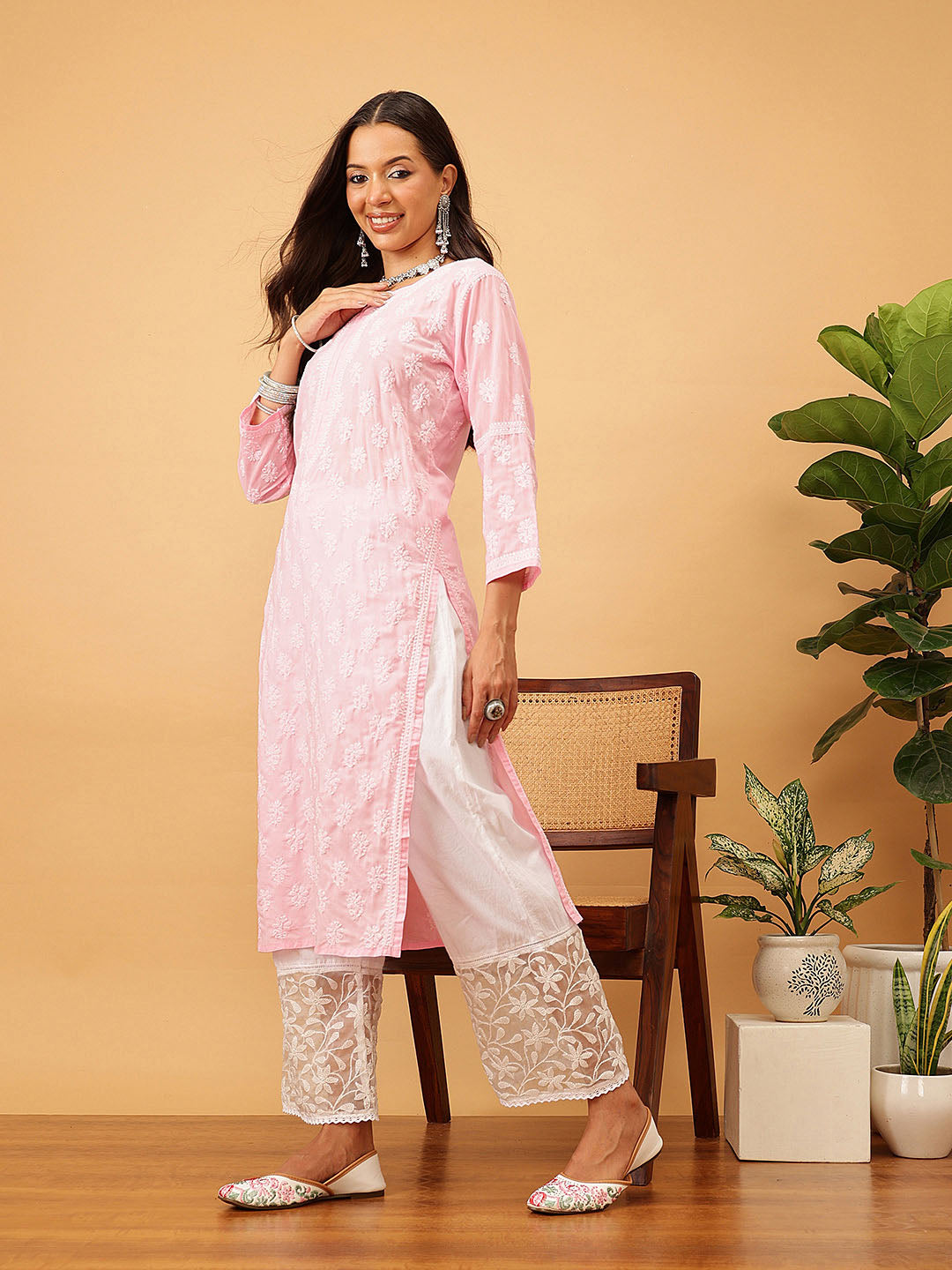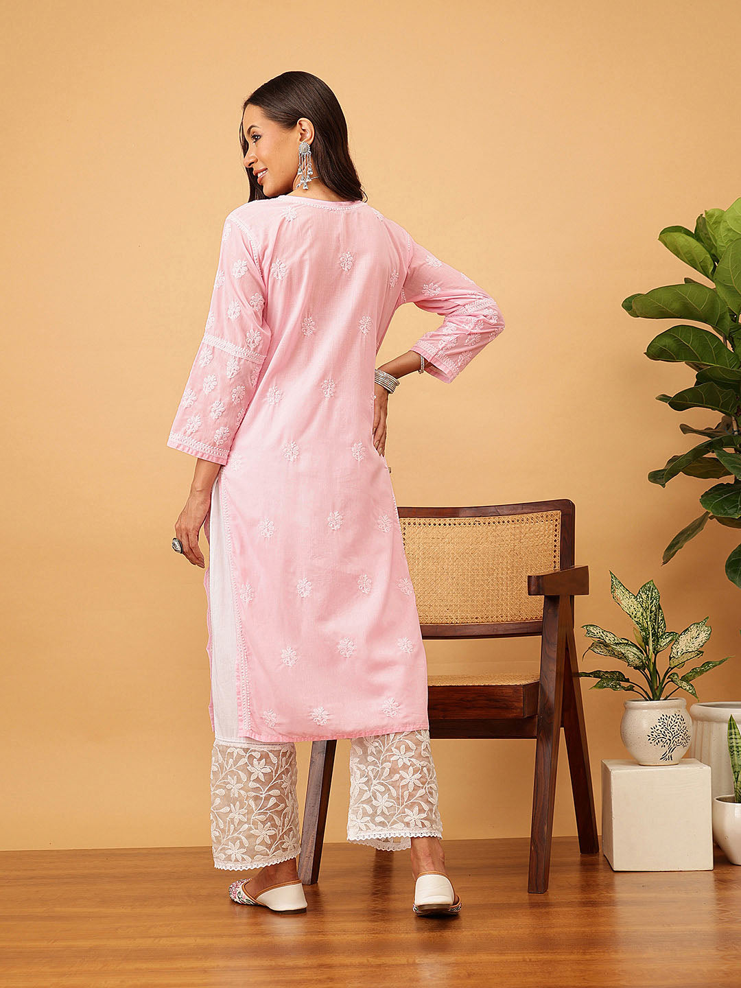Hand Embroidered Lucknowi Chikankari Pink & White Cotton Kurta