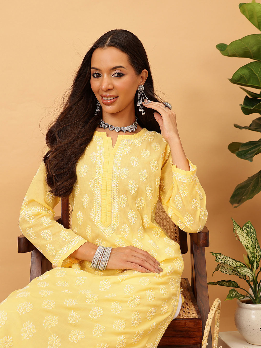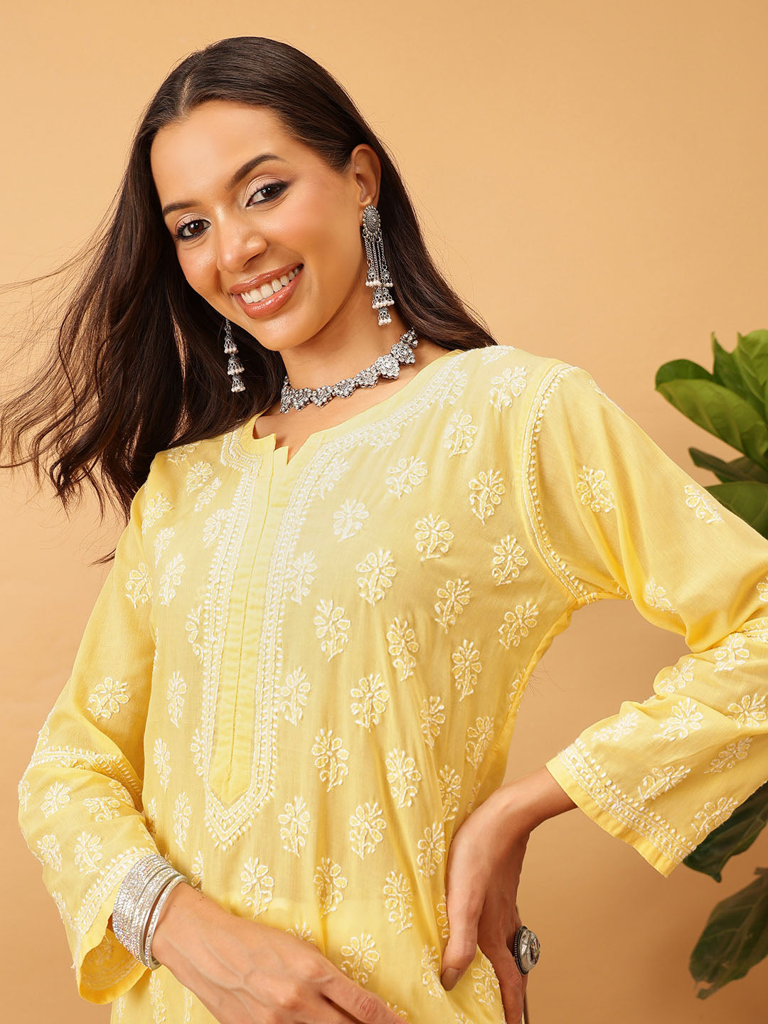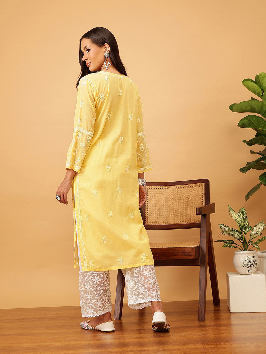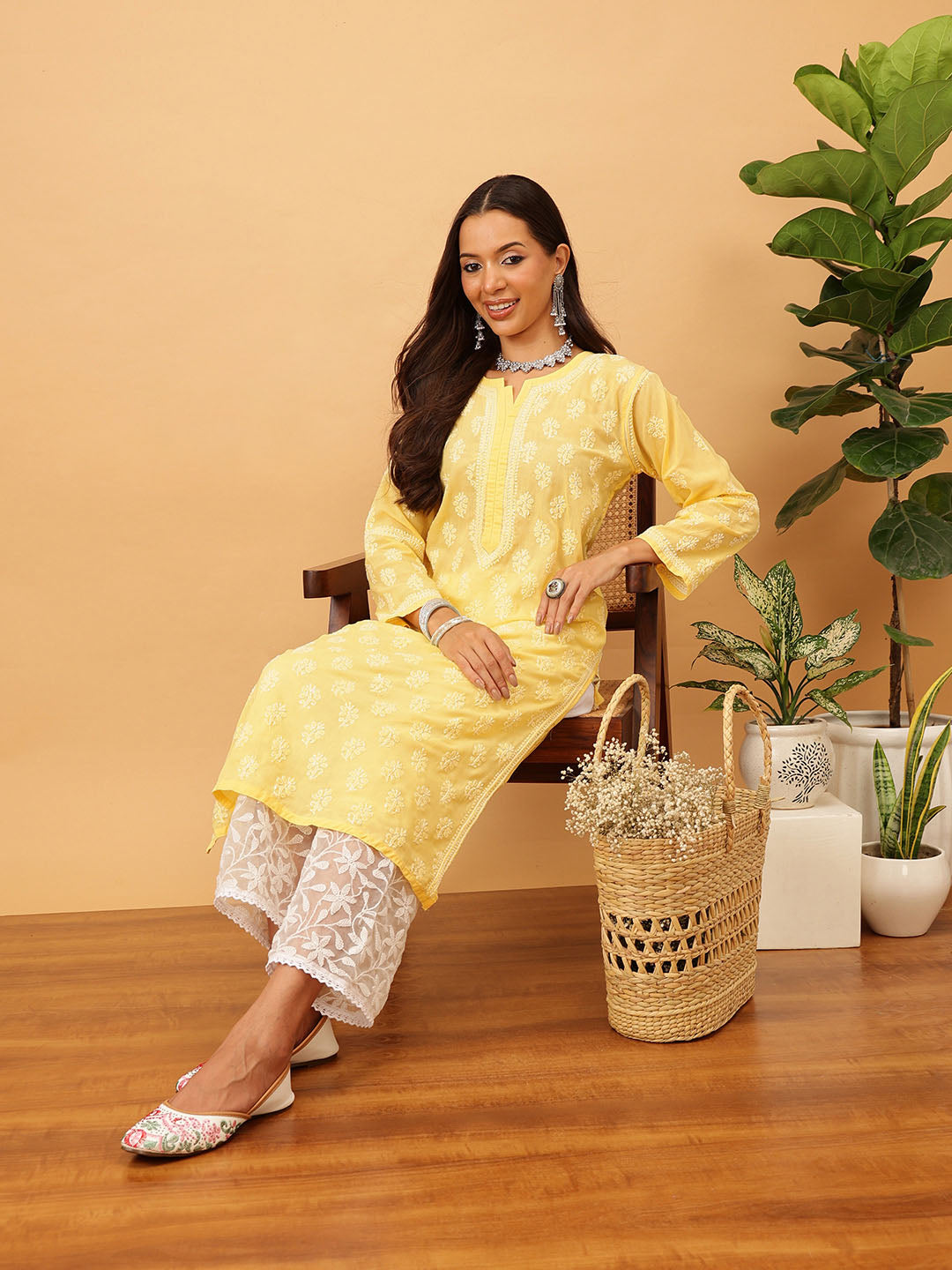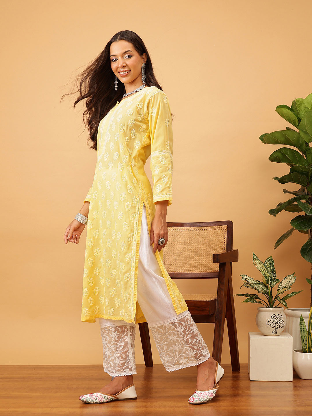 Hand Embroidered Lucknowi Chikankari Yellow & White Cotton Kurta