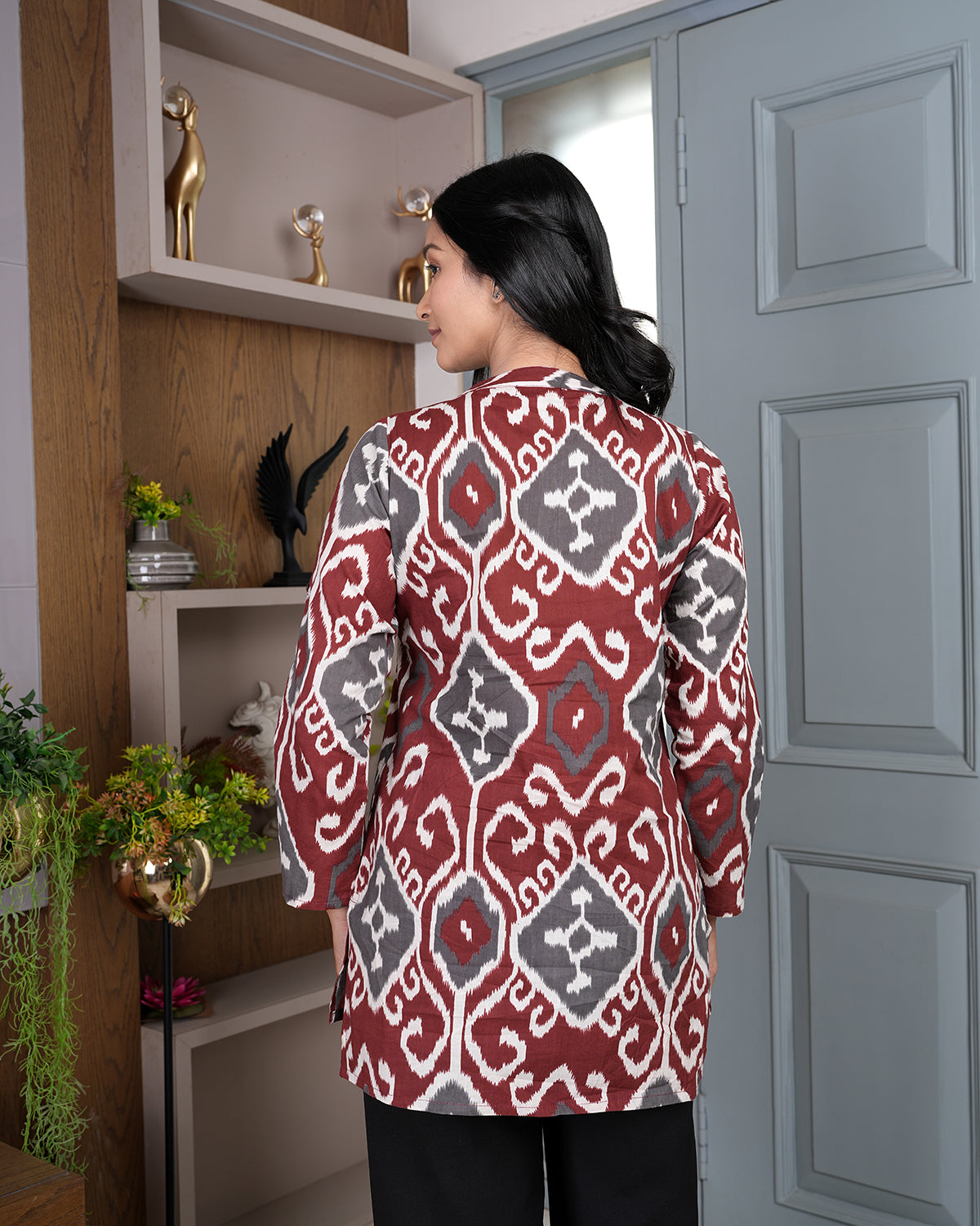 This cotton tunic is designed for everyday comfort with a relaxed and easy fit. The breathable fabric feels soft on the skin and keeps you comfortable throughout the day. The ikat-style print adds a traditional yet modern touch, while the 3/4th Sleeves and button-down design make it suitable for regular wear. Perfect to pair with trousers or jeans for work, casual outings, or daily use.