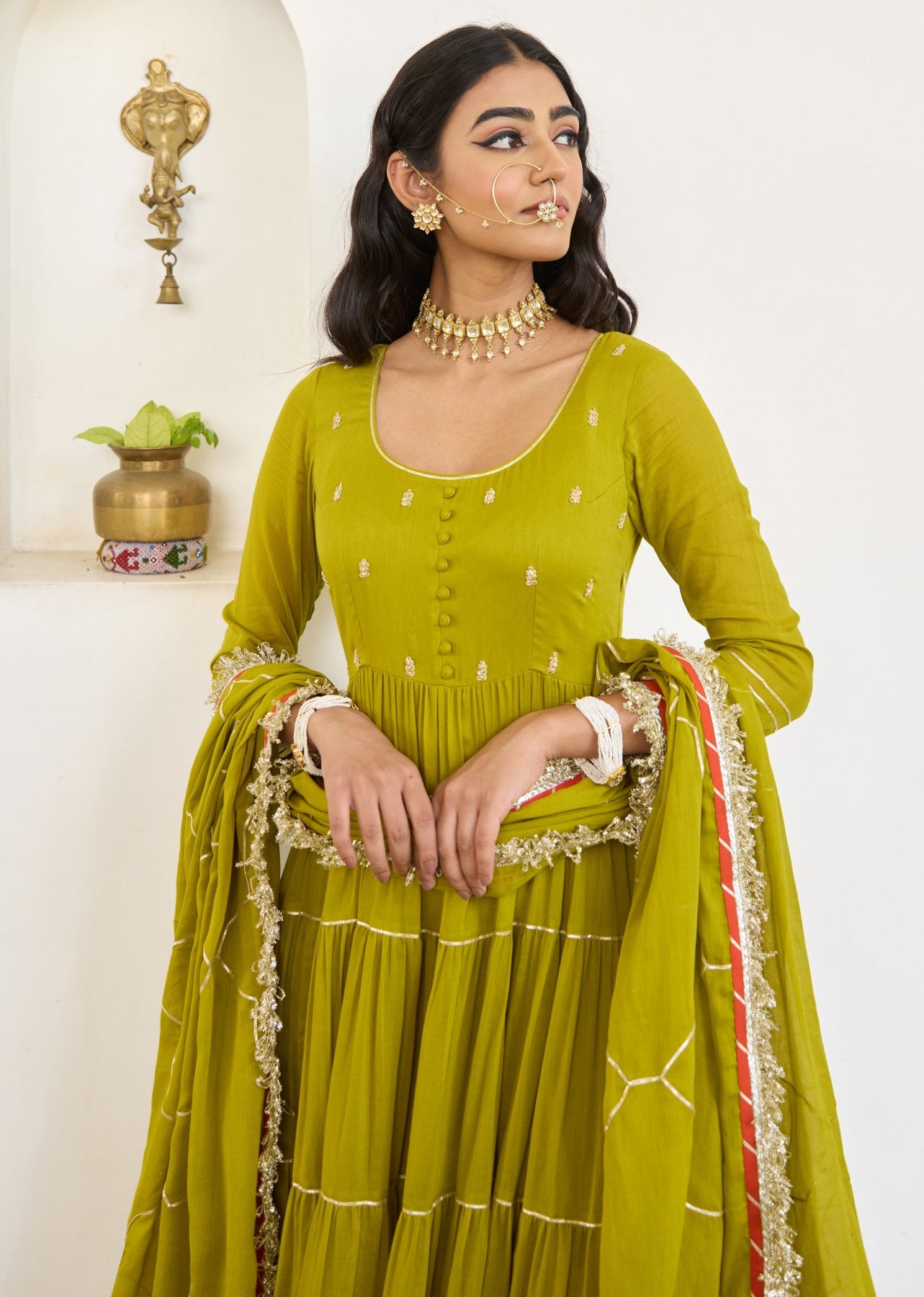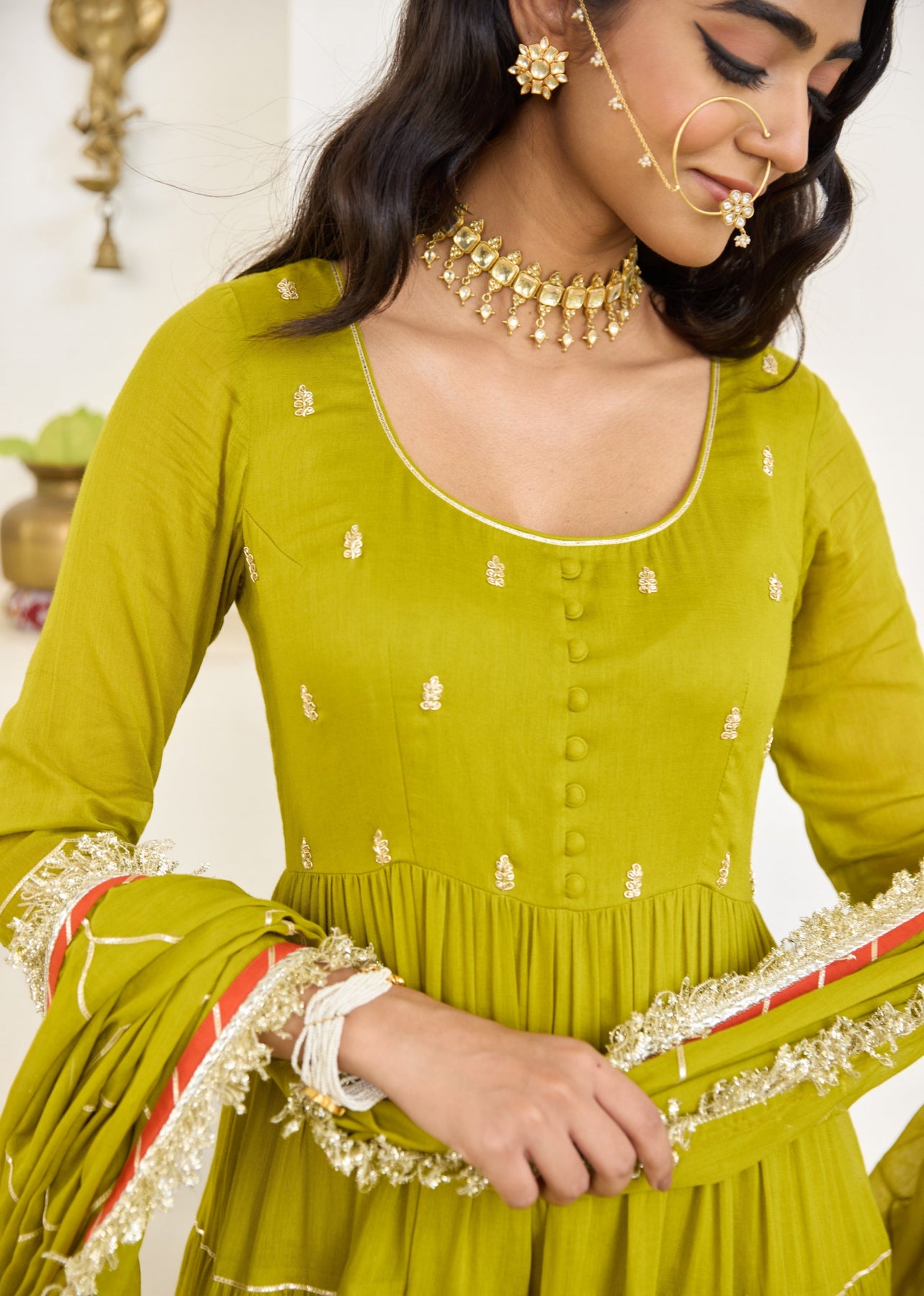 Mehndi green is the color, mulmul is the fabric and this Anarkali flares like it’s got a razz to share. Hand-beaded bodice brings the extra jadoo, while the jal gotta dupatta shimmers just enough to steal the dil.