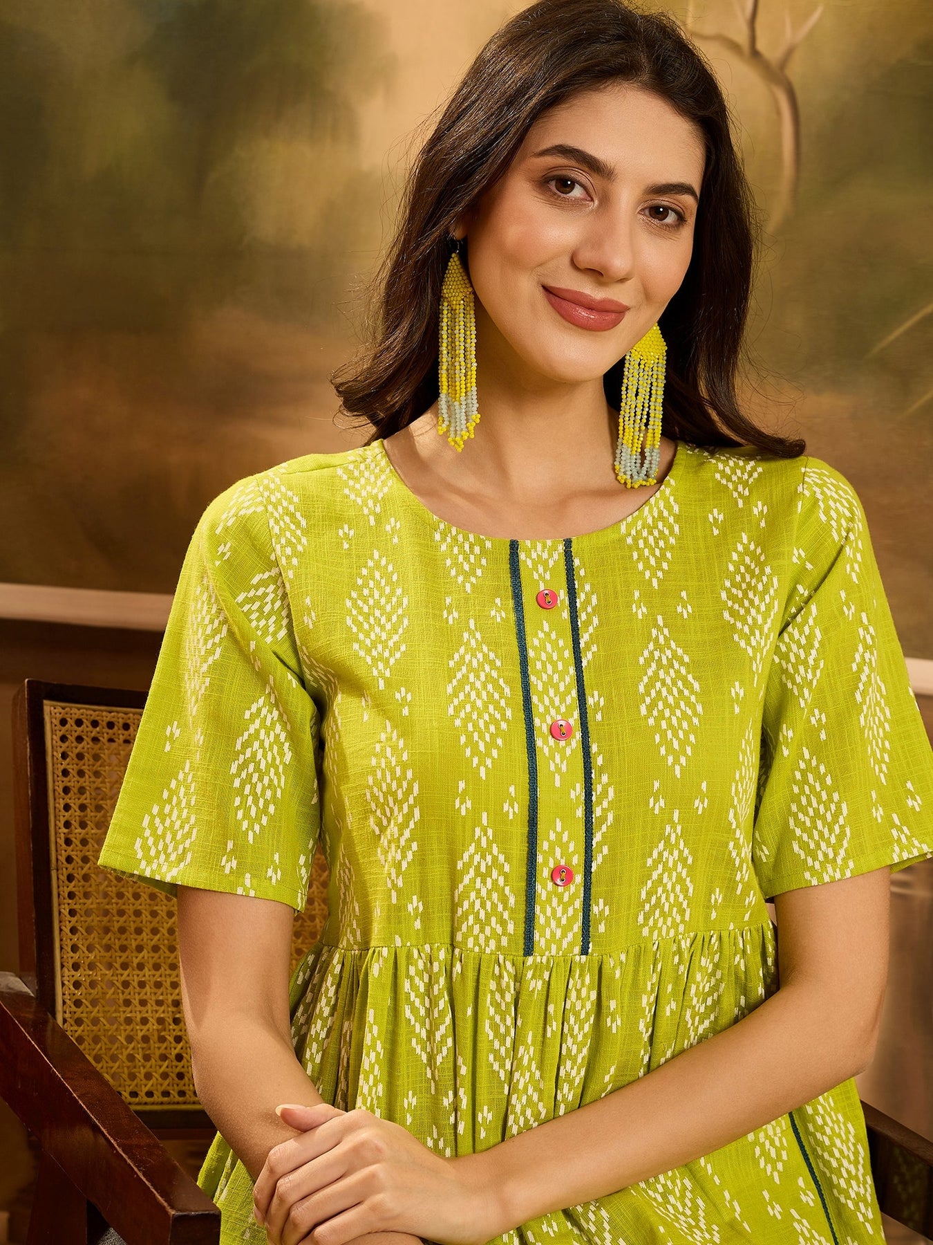 Green printed cotton dress. Dress has Round Neck with buttons and pockets details on it and short regular sleeves. Dress Length- 45'' Inch.