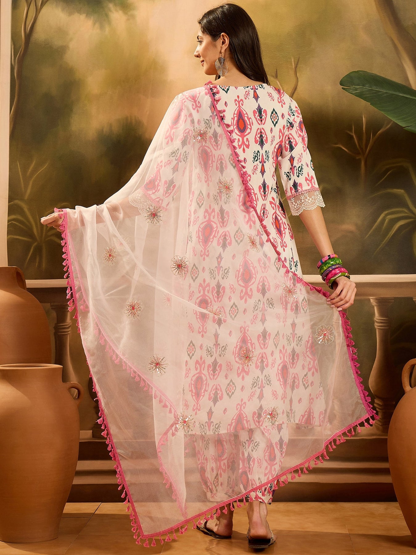 White ikat & embroidered a-line kurta pant dupatta set. Kurta has round neck and regular seleevs with embroidery and tesseles detailing on it. Rayon ikat printed afghani pant has fully elasticated waistbend. Paired with printed organza dupatta. Kurta Length- 48'' Inch, Pant Length- 38'' Inch, Dupatta Lenght- 2.30 Mtr.