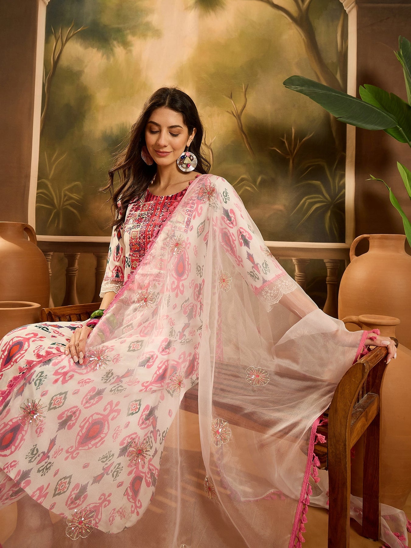 White Ikat Printed & Embroidered Rayon A-Line Kurta Pant Dupatta Set