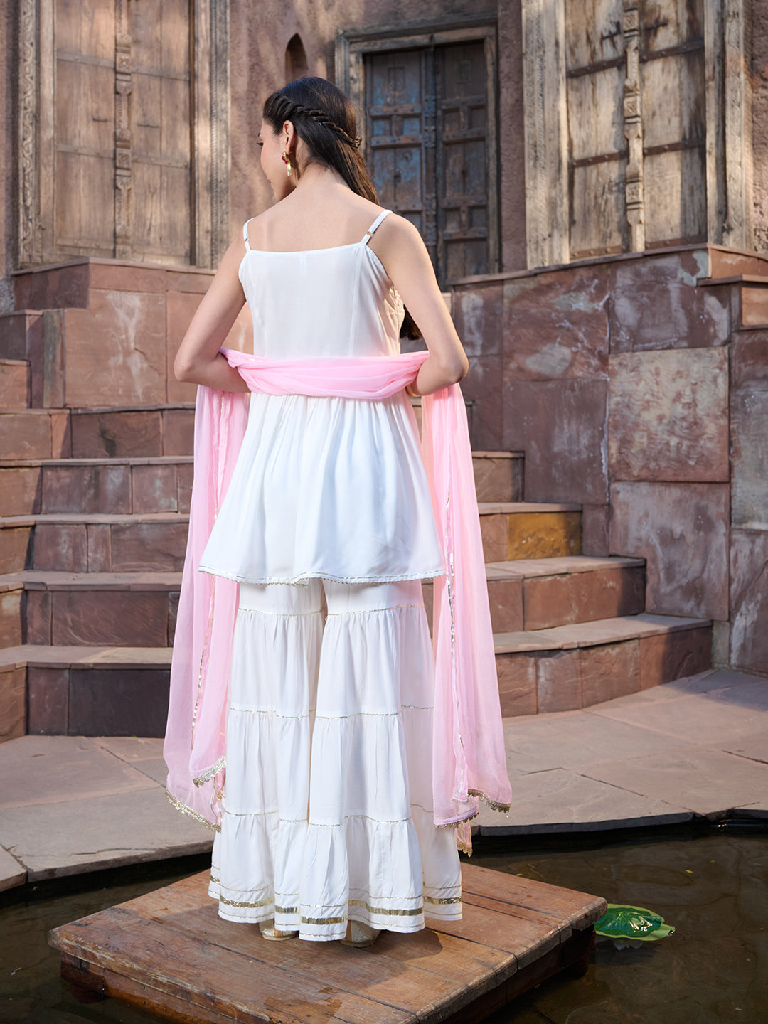 Solid rayon white short kurti v- neck line, strappy sleeves kurti sharara dupatta set. Kurta has sweetheart neck line with zari and sequin work on yoke with gota and bijiya detailing on it. Rayon solid sharara with gota detaling end fully elasticated waistbelt. Paired with solid pink chiffon dupatta. Kurta Length- 30" Inch, Sharara Length- 38" Inch, Dupatta Length- 2.30 Mtr.
