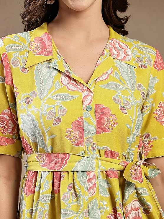 Yellow floral printed calf length tiered dress in rayon fabric. It is shirt collar and half sleeves dress has full button placket with tie-up belt in waist. Dress Length- 48'' Inch.