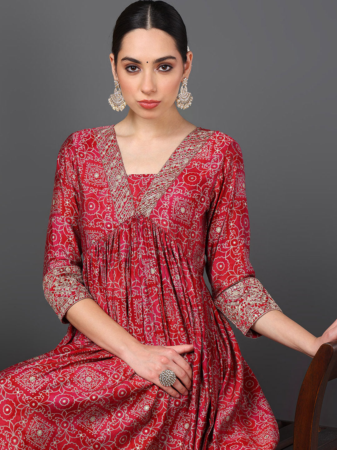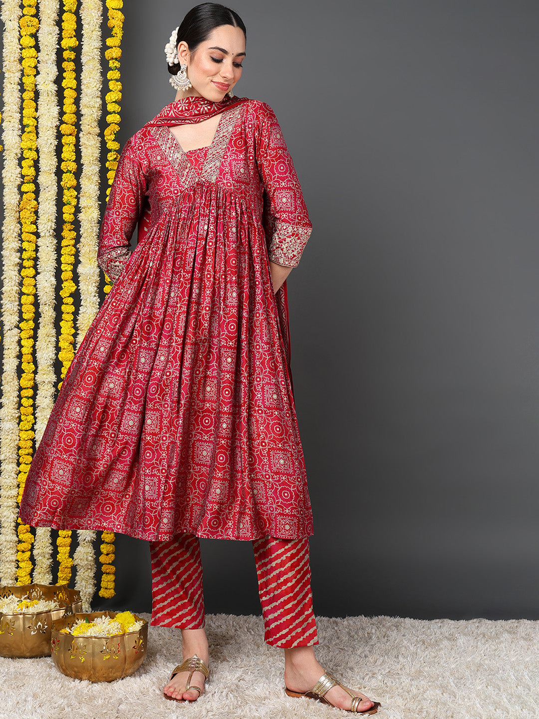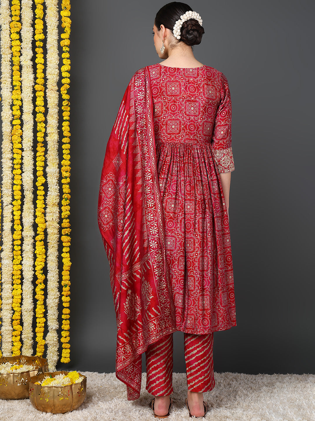 Maroon Polyester Ethnic Motifs Printed Flared Kurta Trouser With Dupatta