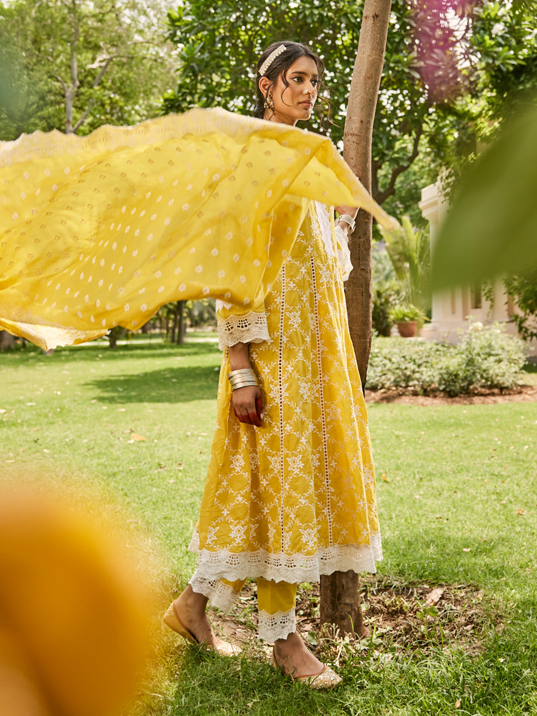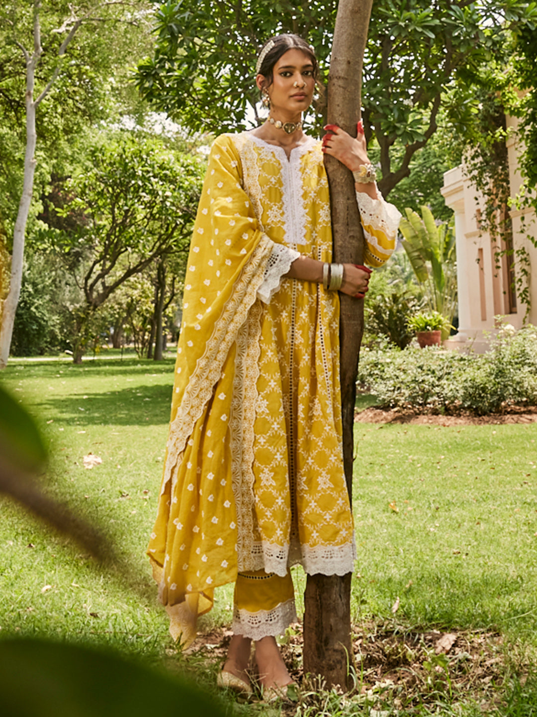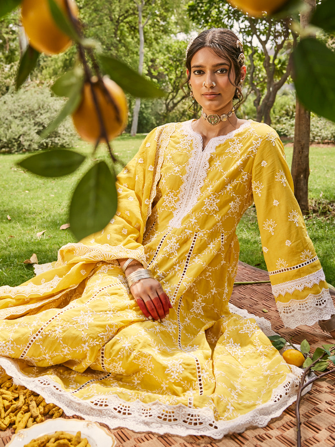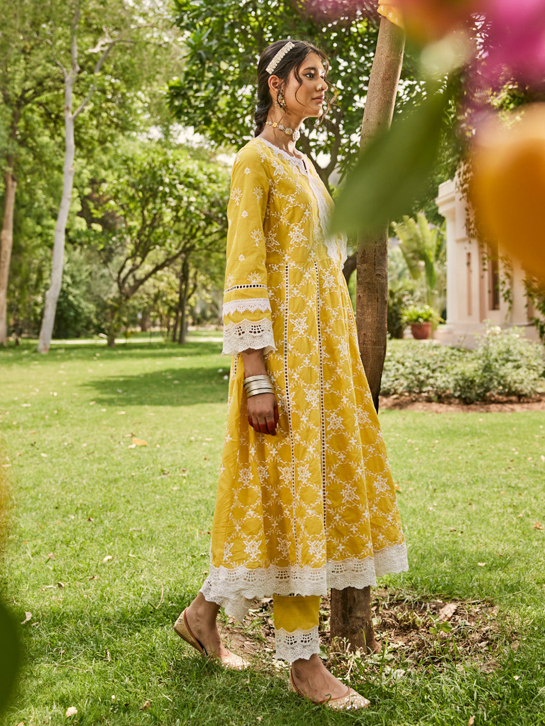 This Stunning Cotton Attire Is Enhanced With Beautiful Floral Schiffli Anarkali Highlighted With Accessories At The Yoke And Complimented With Embroidered Dupatta Kurta Design: Floral Schiffli Work Anarkali Round Neck, Long Sleeves Calf Length With Flared Hem Trousers Design: Solid Trousers Partially Elasticated Waistband Slip-On Closure