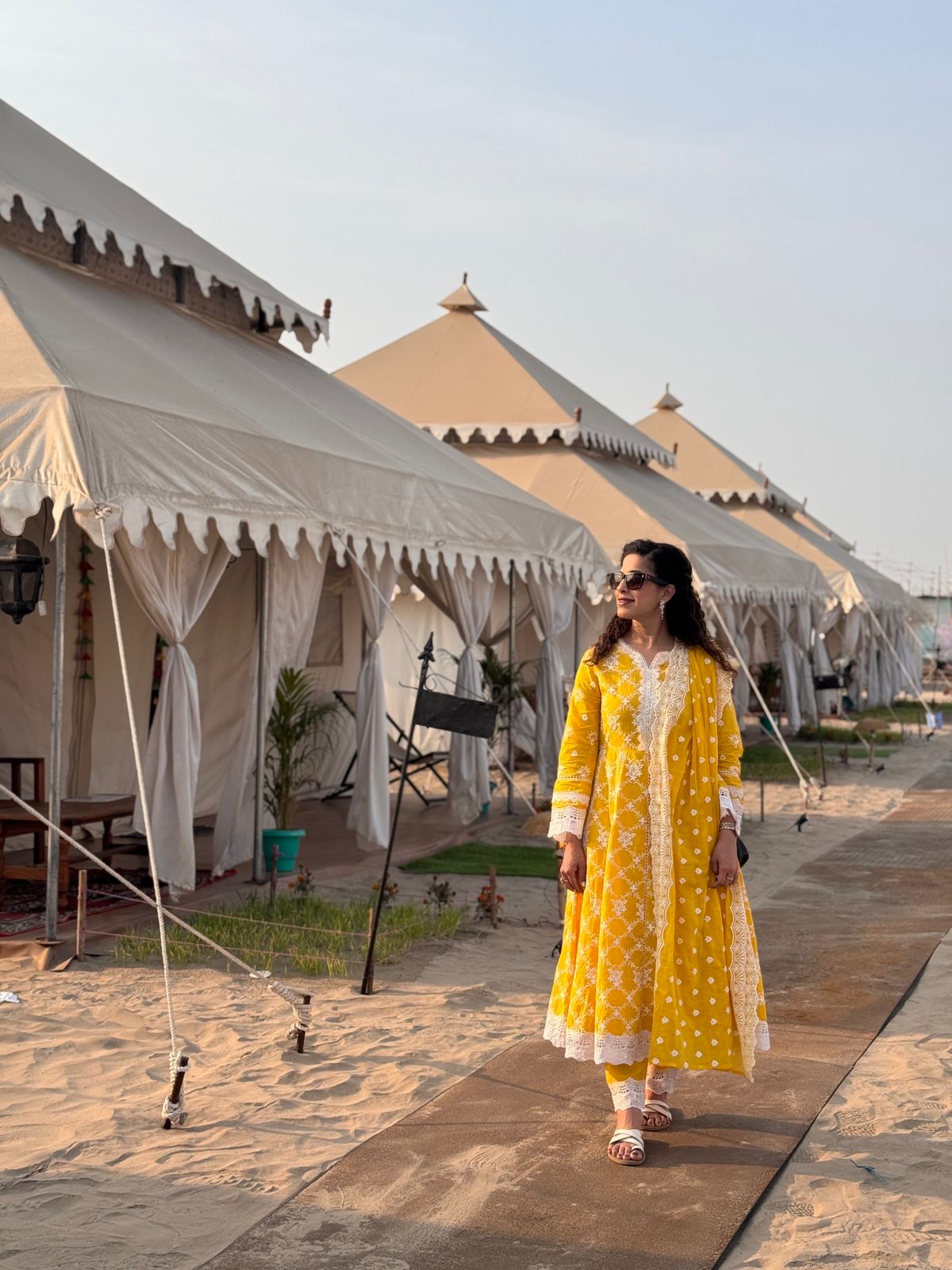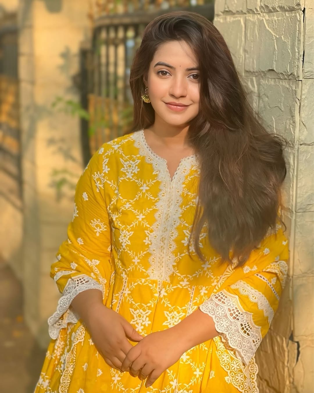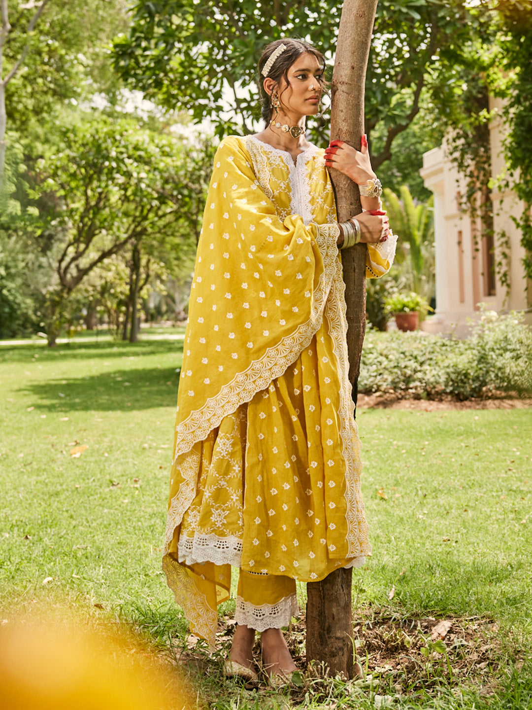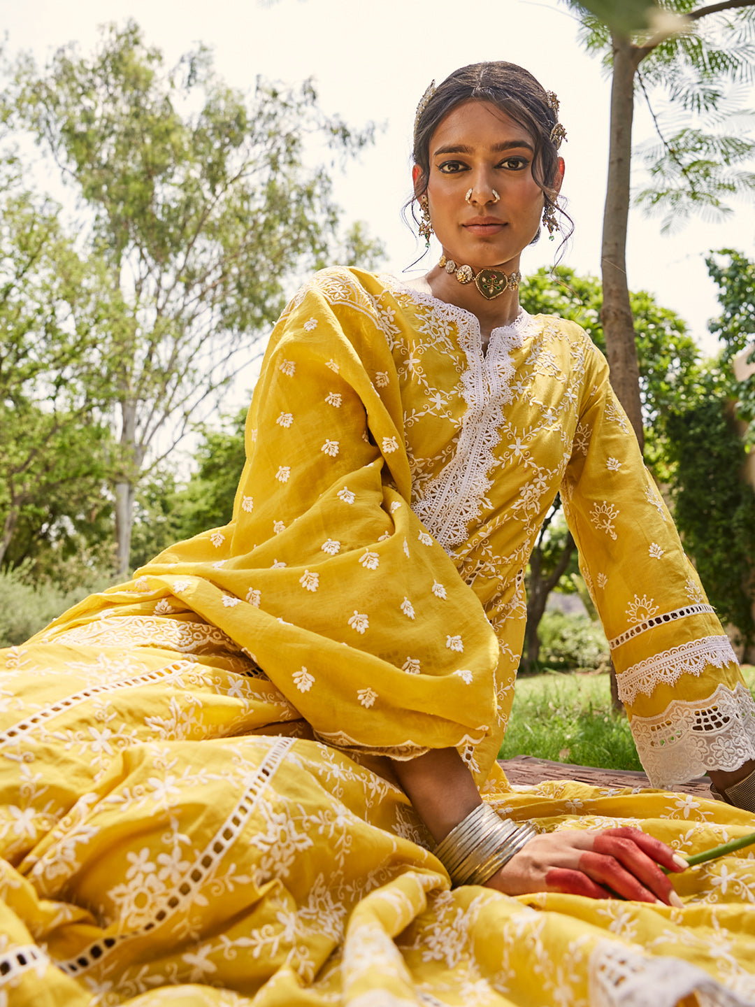 This Stunning Cotton Attire Is Enhanced With Beautiful Floral Schiffli Anarkali Highlighted With Accessories At The Yoke And Complimented With Embroidered Dupatta Kurta Design: Floral Schiffli Work Anarkali Round Neck, Long Sleeves Calf Length With Flared Hem Trousers Design: Solid Trousers Partially Elasticated Waistband Slip-On Closure