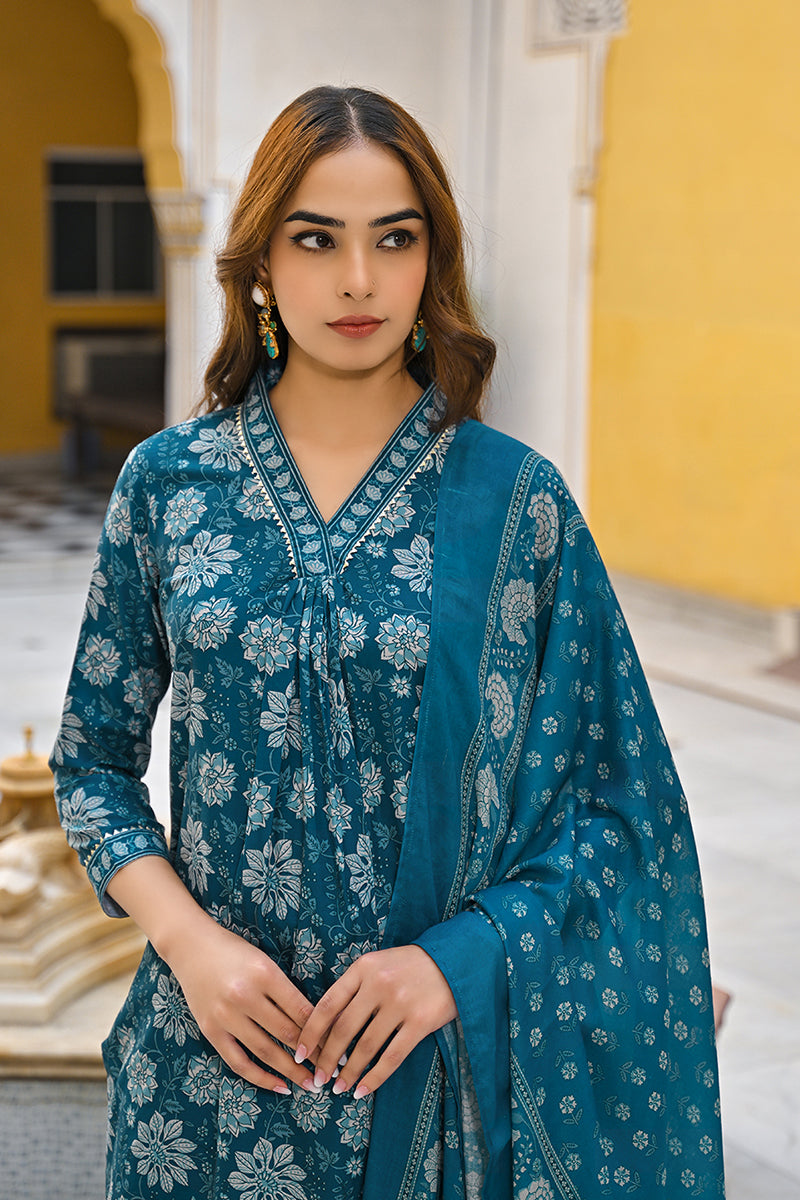 Soft Hues And Floral Prints Define This Blue Rayon Blend Kurta Set. Designed For Everyday Ease And Subtle Charm, It Comes With Coordinated Pants And A Dupatta — Easy To Wear, Hard To Ignore.