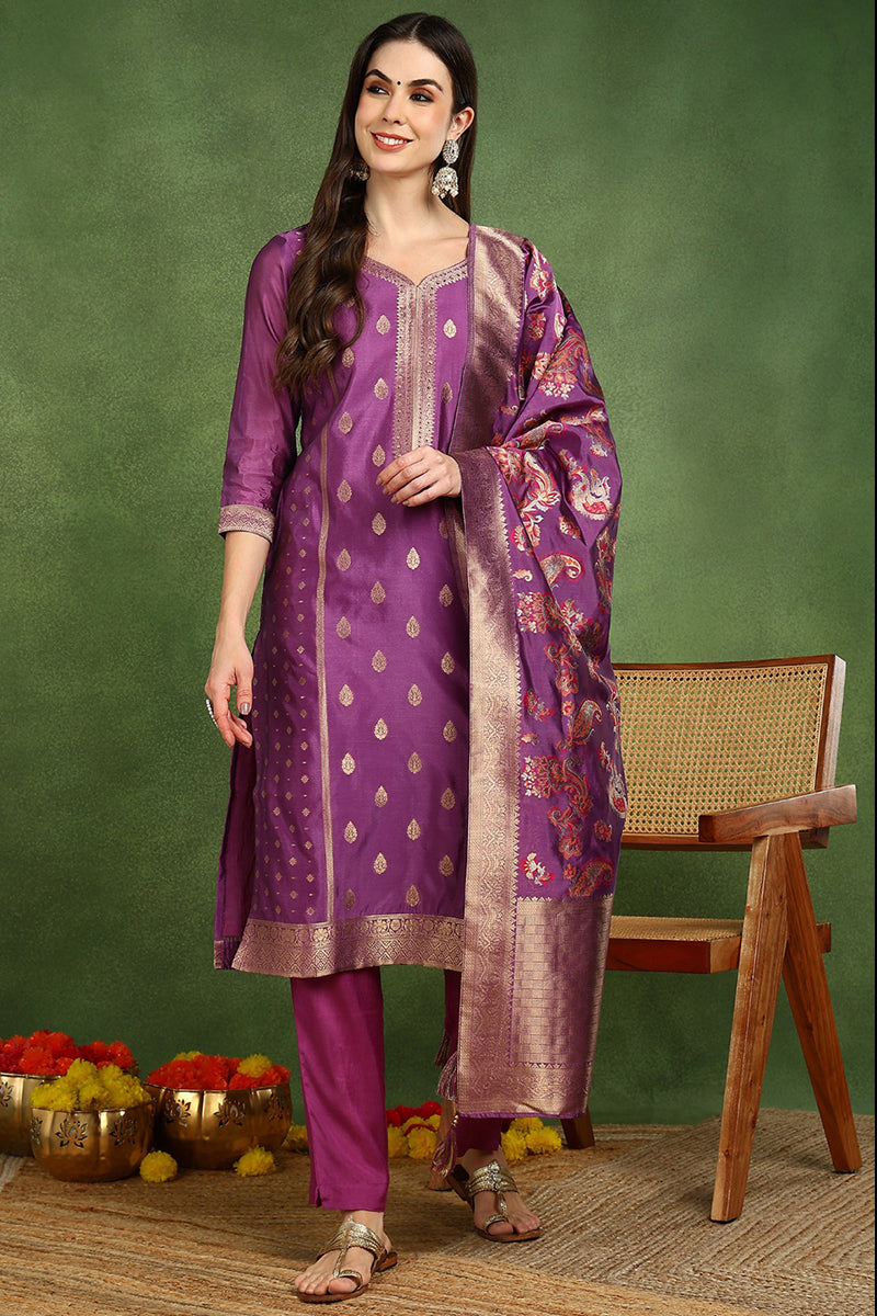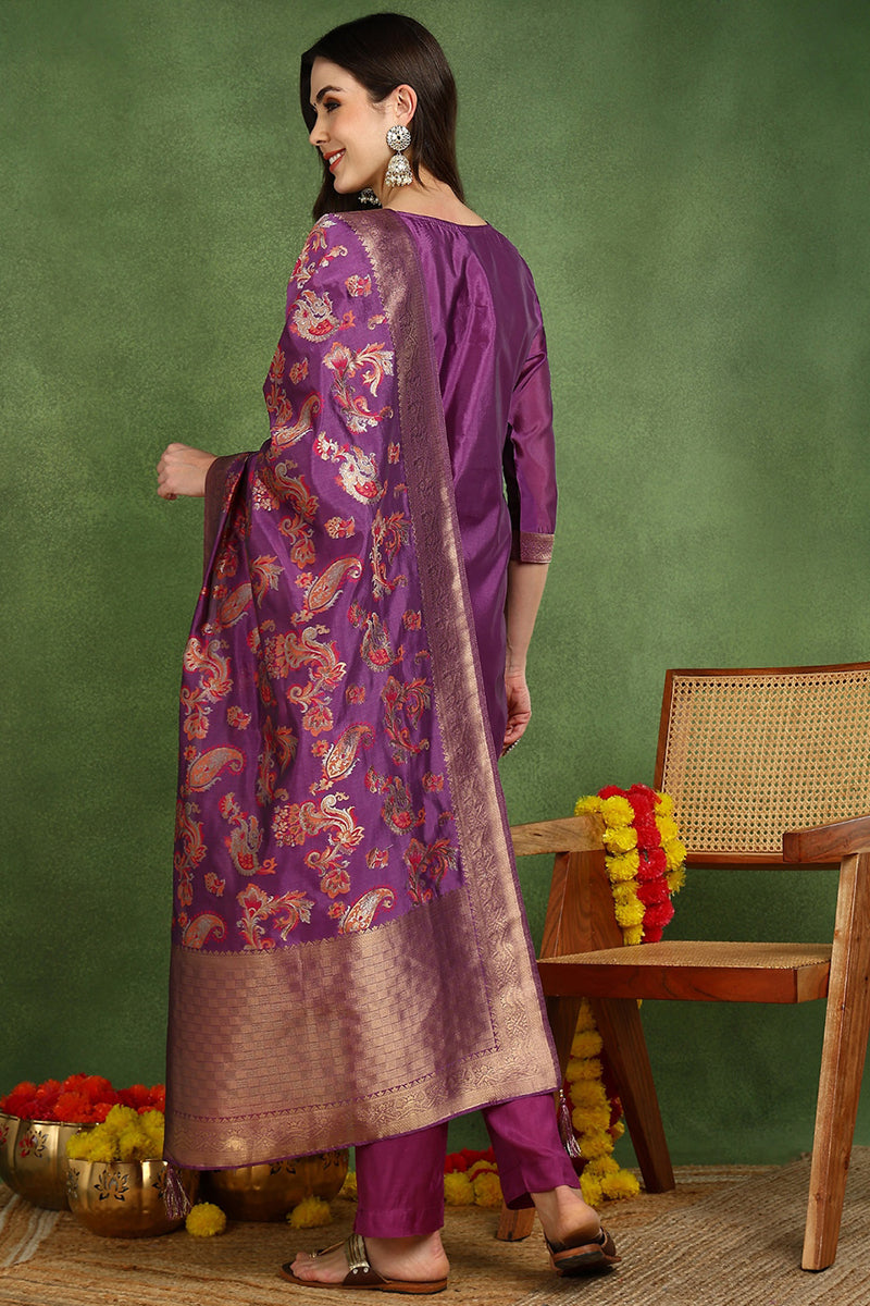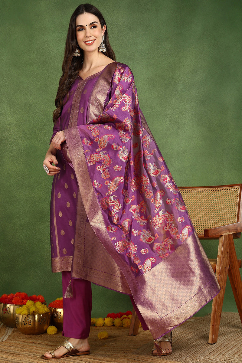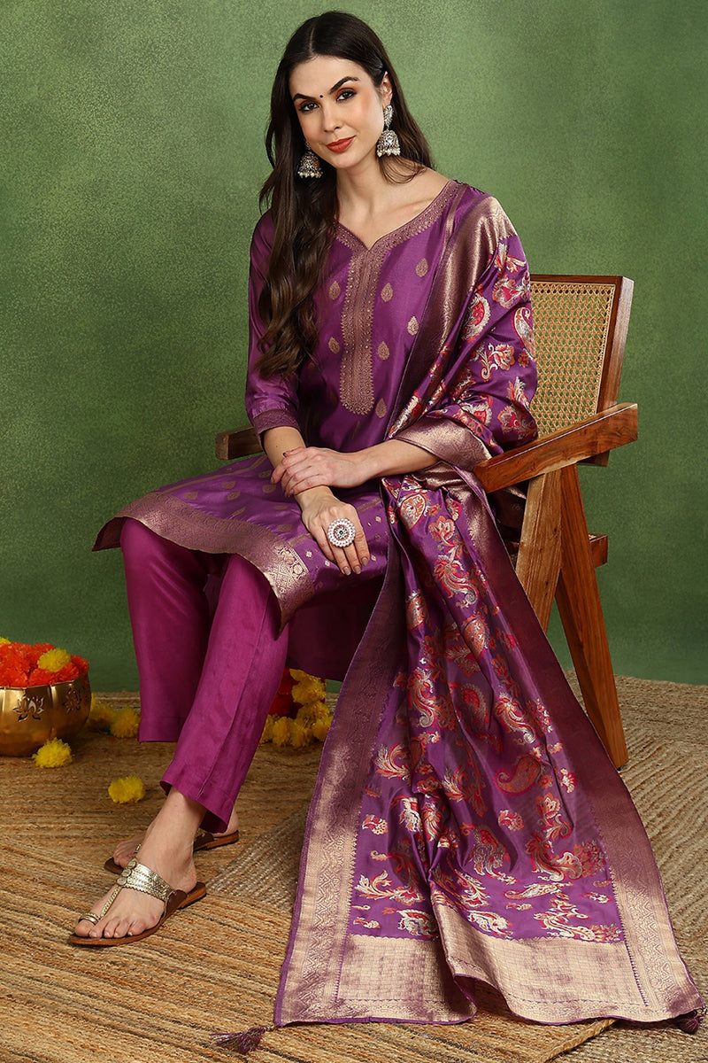 With Its Lustrous Texture And Woven Patterns, This Purple Poly Chanderi Kurta Set Blends Festive Flair With Modern Appeal. Comes Complete With Matching Pants And Dupatta For A Graceful Finish.