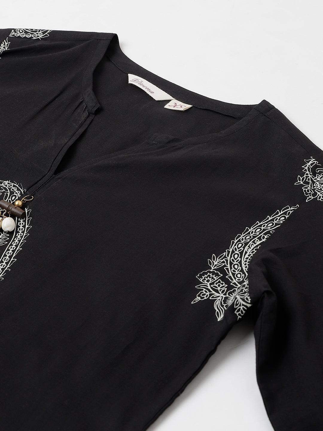 Classic Black Cotton Kurta With Ethnic Motif Print And Seap Latkan Detailing At The Neck, Paired With Flared Paisley Print Harem Pants For All-Day Comfort. Suitable For Formal And Casual Occasions. Specifications Color: Black | Neck: Round Neck | Print: Floral | Hemline: Curved | Sleeve: Three-Quarter Regular | Slit: Side Slits | Kurta Length: Knee Length | Top Fabric: Pure Cotton | Bottom Fabric: Pure Cotton | Bottom Type: Harem Pant | Dupatta: Not Included