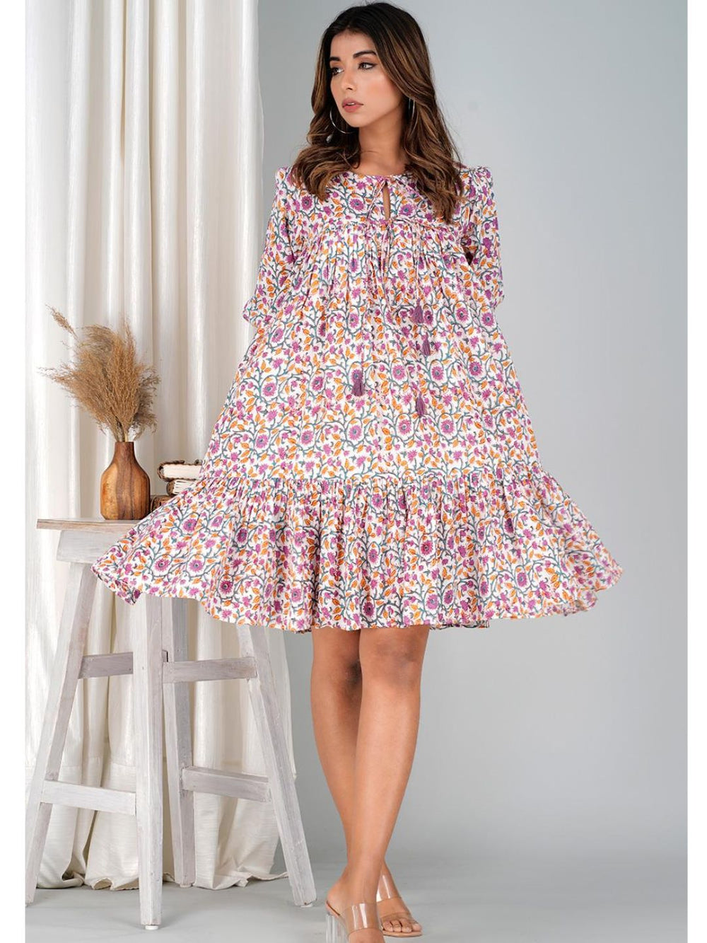 This Floral Violet colored Tiered Dress features Knee-Length Partywear and Semi-Formal Dress with 3/4th Puffy Sleeves, Close Neckline with tassels and Wide angle flares. The dress has mauve and yellow floral prints on white background, and goes best with transparent block heels and nude colored wedges.