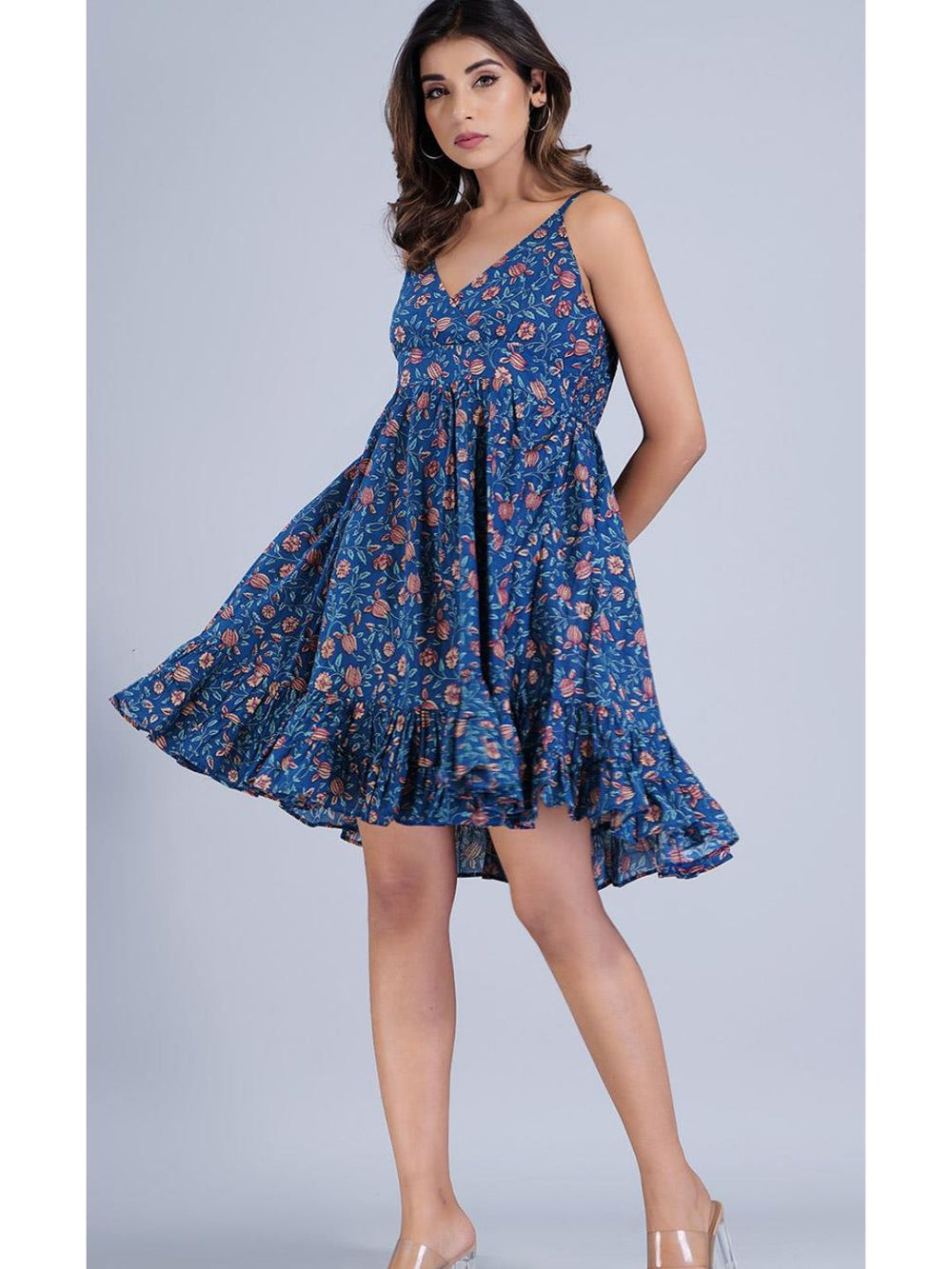 This Is A Navy Blue Colored Short Strappy Dress With Tiers That Features Cotton Fabric, 1 Broad Tier Hemline, V-Shaped Neckline, Sleeveless Strap Sleeves, The Dress Length Is 36 Inches, And Has Got Multicolored Floral Prints All Over The Dress.