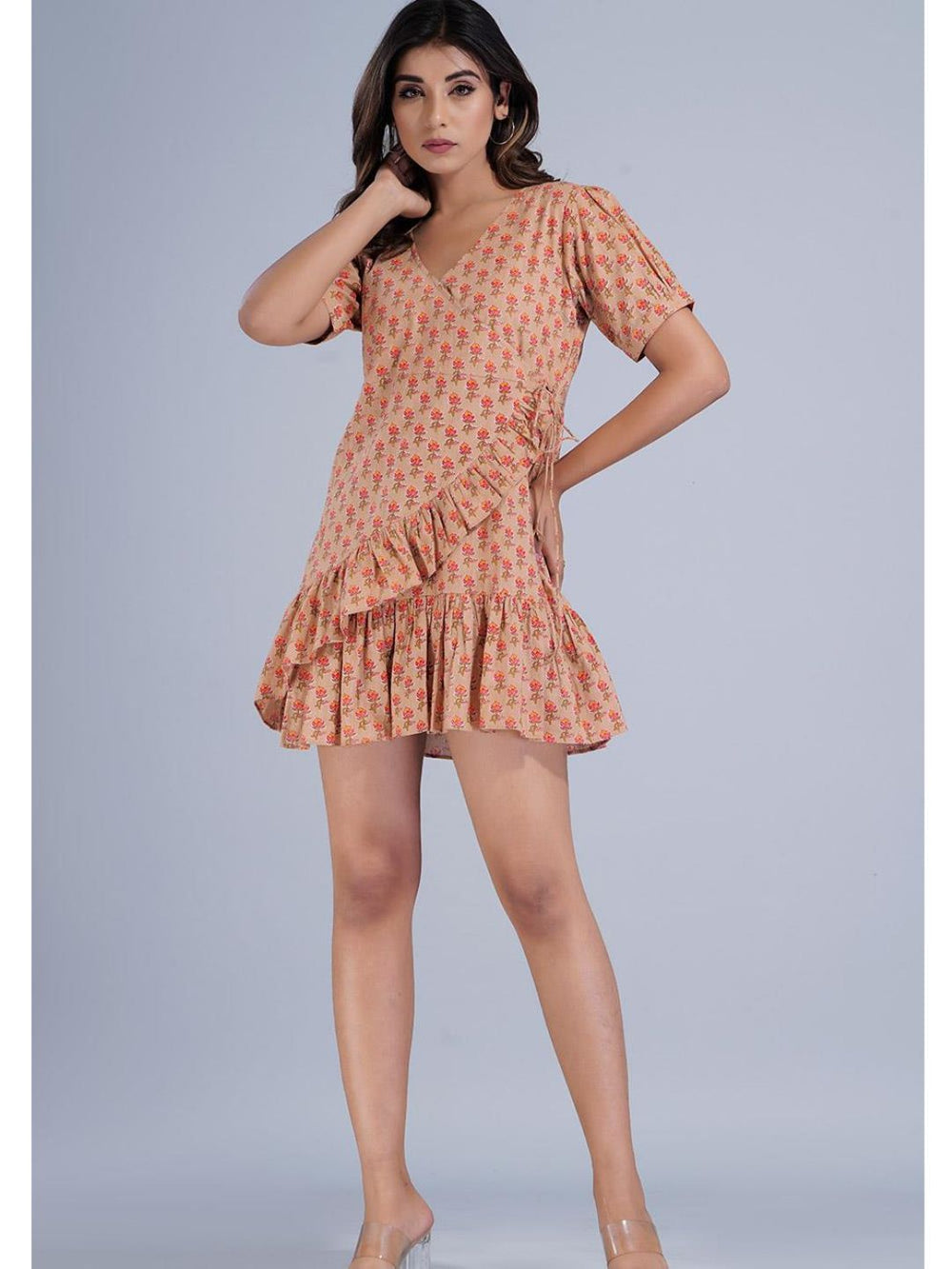 This Is A Peachy Orange Colored Short Wrap Style Dress That Features Cotton Fabric, Broad Tier Through The Wrap And Below Hemline, V-Shaped Neckline, Short Half Sleeves, The Dress Length Is 34 Inches, And Has Got Red Floral Prints All Over The Dress.