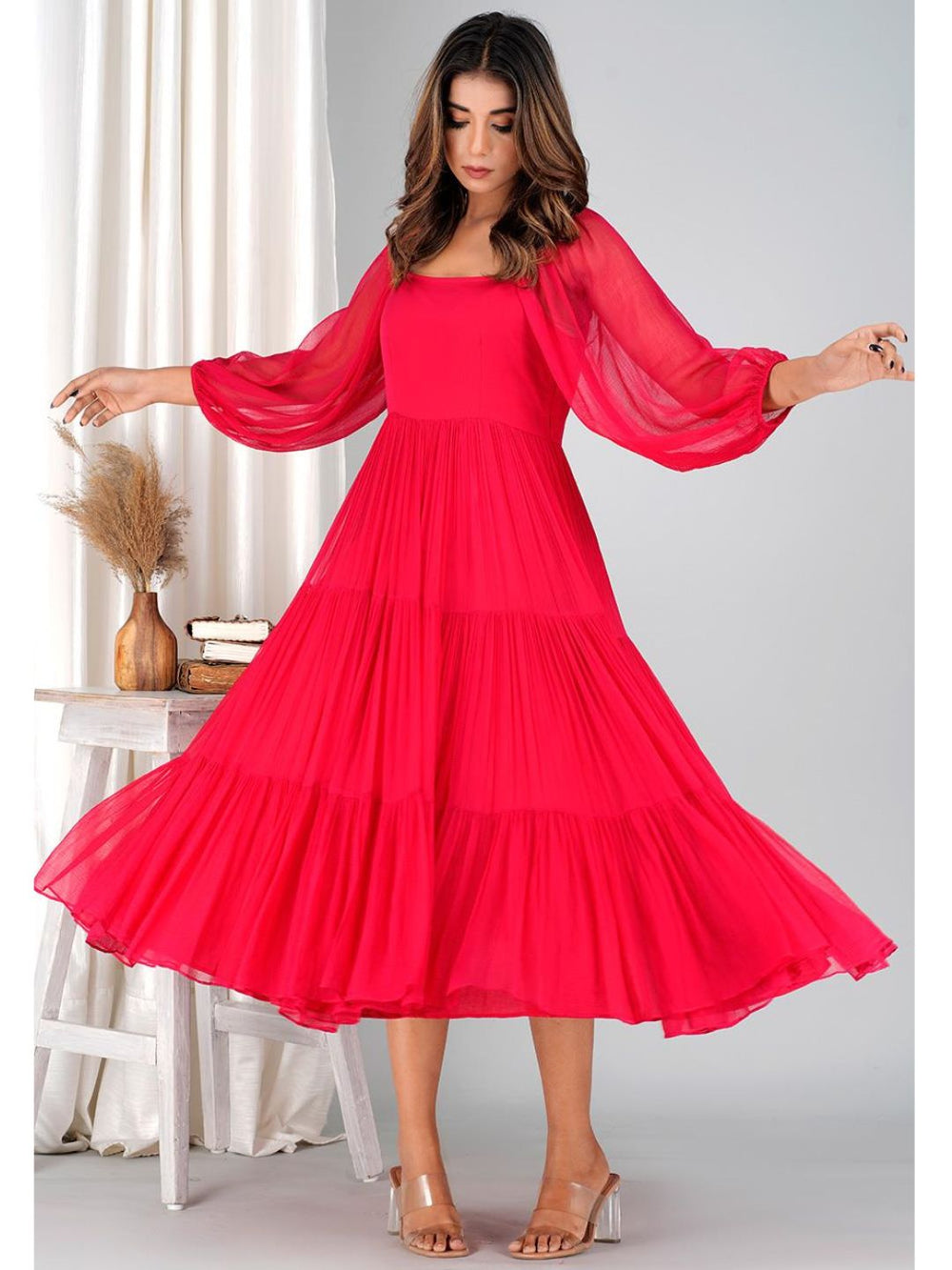 This Strawberry Pink colored Bright Tiered Dress features Calf-Length Grown or Long Partywear Dress with Full length Puffy Slit Cut Decorative Sleeves, Wide Boat neck, and Wide angle flares