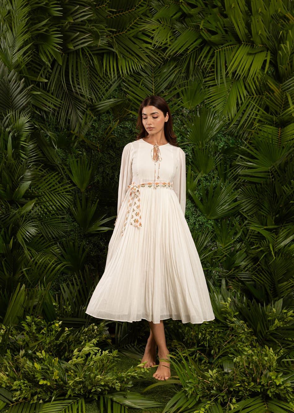 Elevate Your Style With This Stunning White Mulmul Dress. The Relaxed Fit Features A Plain Front And A Floral-Printed Backside, Creating A Unique Look. Gathers, A Tieable Keyhole Pattern With A Knot, And Balloon Sleeves With Printed Cuff And Button Detailing Add Charm. The Mid-Calf Length Dress Comes With A Floral Detachable Belt, Completing The Ensemble Effortlessly. Be Fashion-Forward In This Exquisite Outfit!