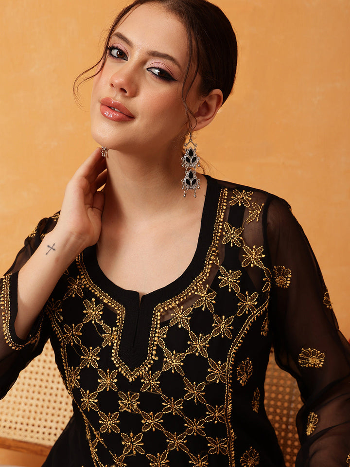 This is a Black & Gold Georgette Embroidery Chikankari Tunic With Slip