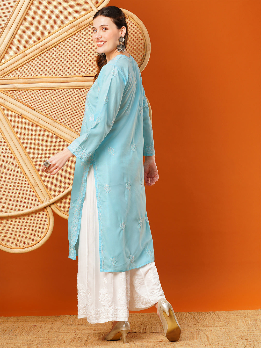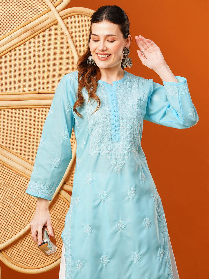 This is a Hand Embroidered Chikankari Blue Cotton Kurta