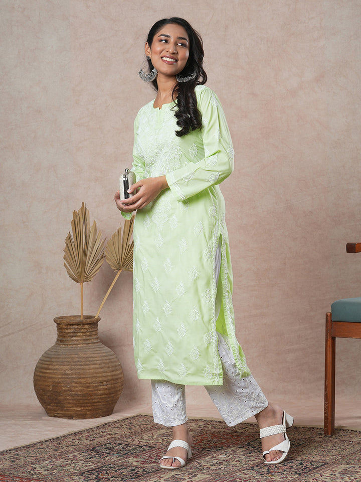 This is a Hand Embroidered Chikankari Liril Green Cotton Kurta