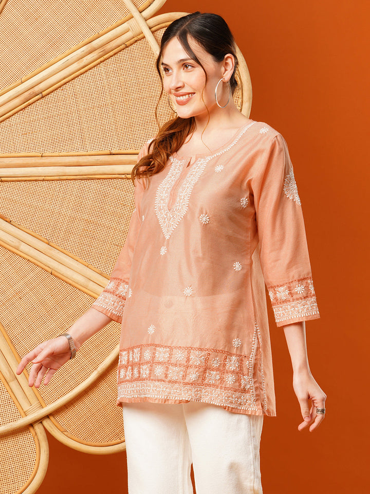 This is a Peach Chanderi Ethnic Motifs Embroidered Straight Kurti