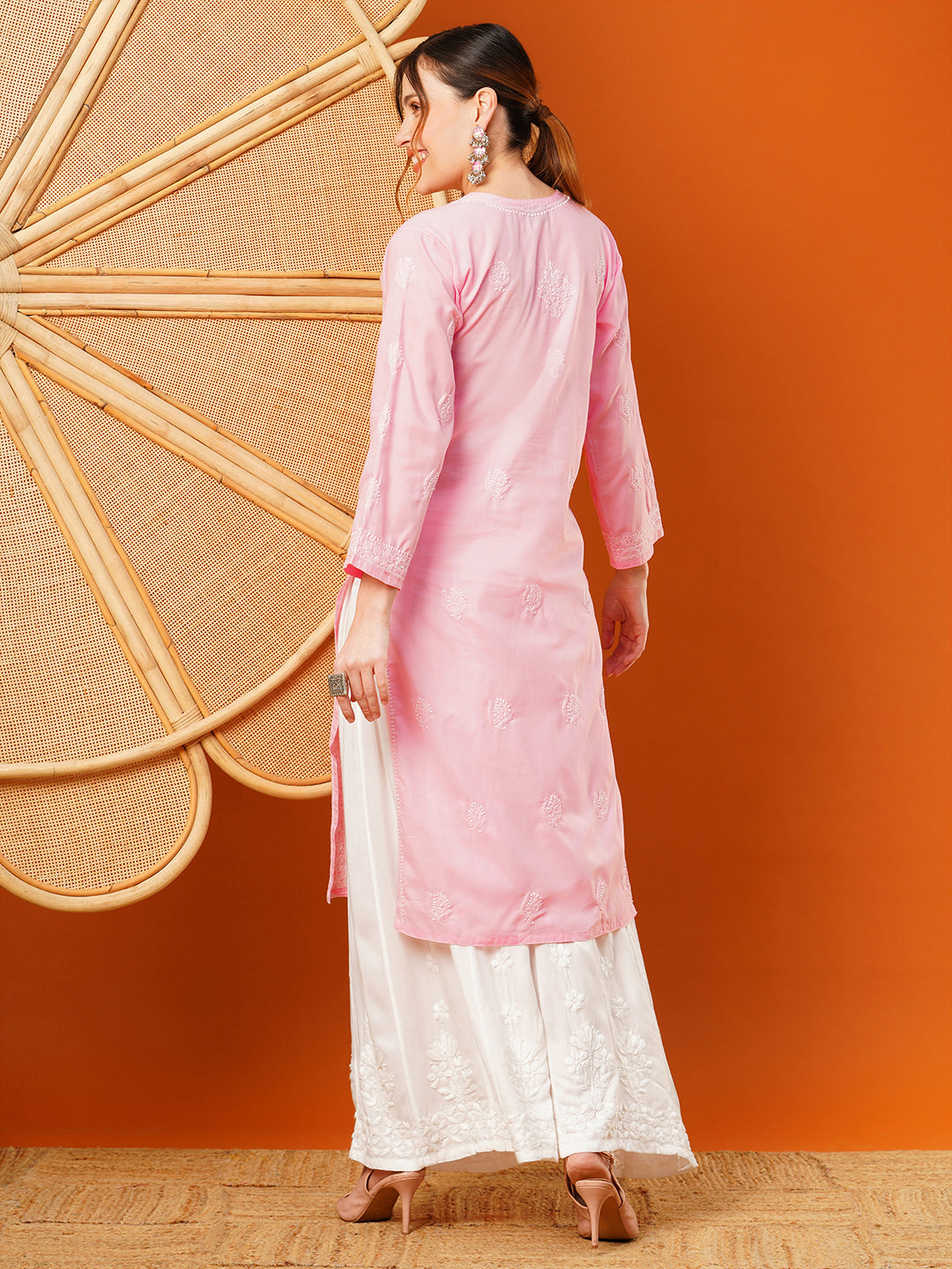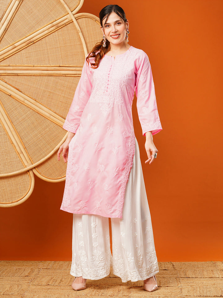 This is a Hand Embroidered Chikankari Pink Cotton Kurta