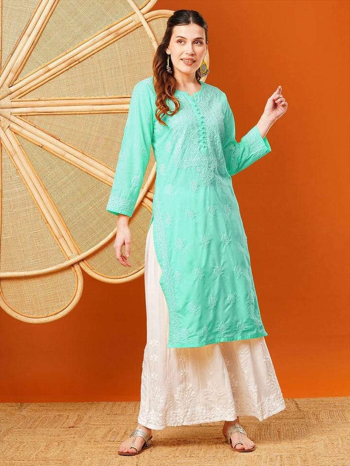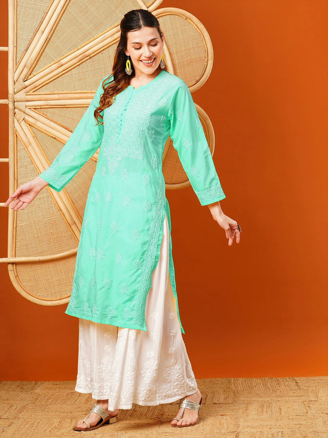 This is a Hand Embroidered Chikankari Sea Green Cotton Kurta