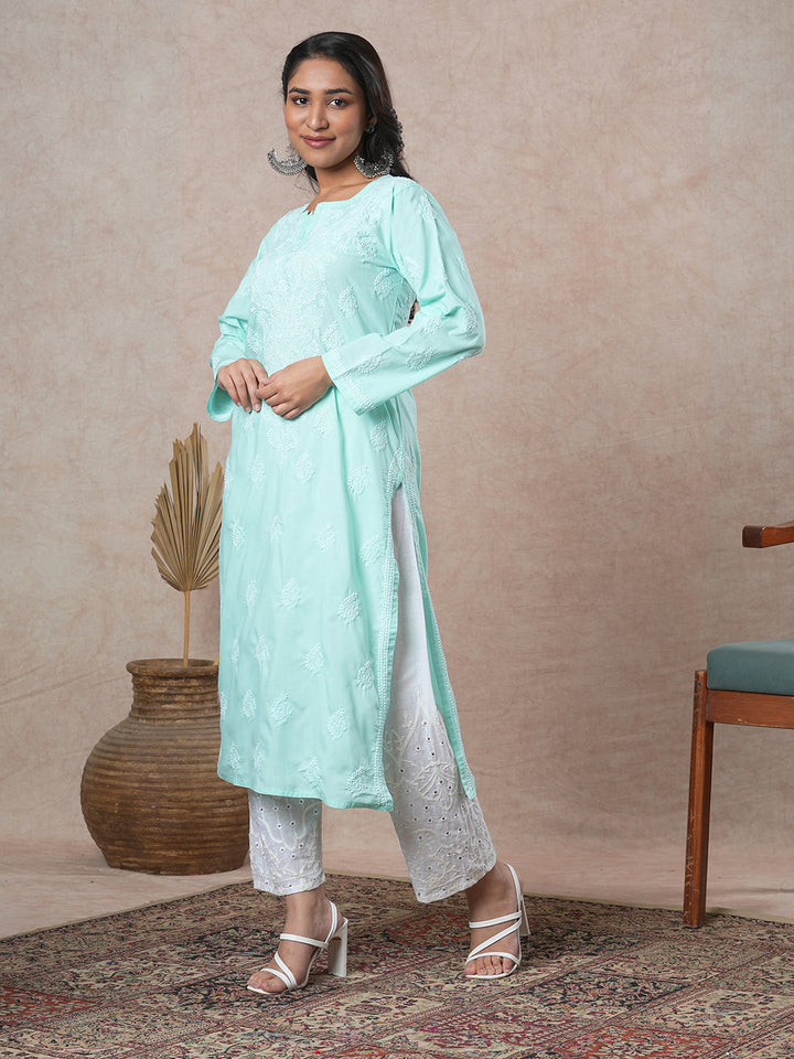 -Print or Pattern Type: Ethnic Motifs -Slit Detail : Side Slits -Weave Pattern: Regular -Weave Type: Machine Weave -Sleeve Length: Three-Quarter Sleeves -Neck: Round Neck -Ornamentation: Chikankari -Shape: Straight -Length: Calf Length -Hemline: Straight -Front Length ( Inches ): 45Material & Care: