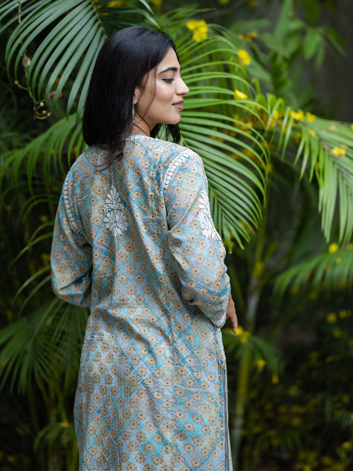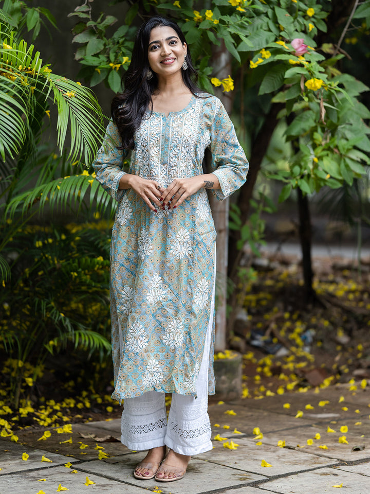 This is a Hand Embroidered Chikankari Sea Green & White Mul Cotton Kurta
