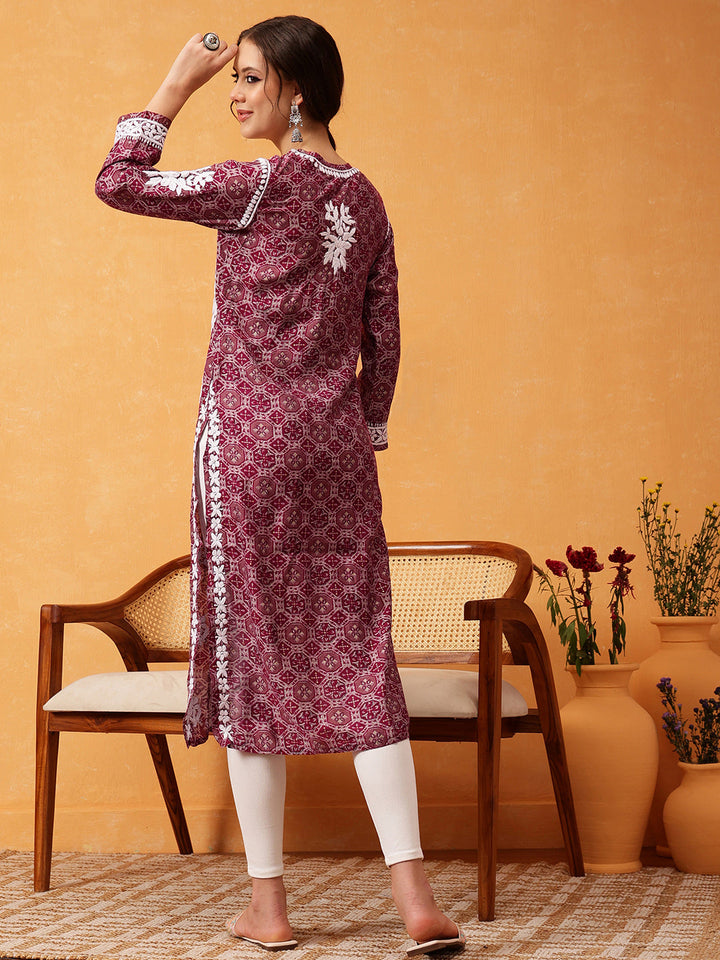 -Print or Pattern Type: Ethnic Motifs -Slit Detail : Side Slits -Weave Pattern: Regular -Weave Type: Machine Weave -Sleeve Length: Three-Quarter Sleeves -Neck: Round Neck -Ornamentation: Chikankari -Shape: Straight -Length: Calf Length -Hemline: Straight -Front Length ( Inches ): 43Material & Care: