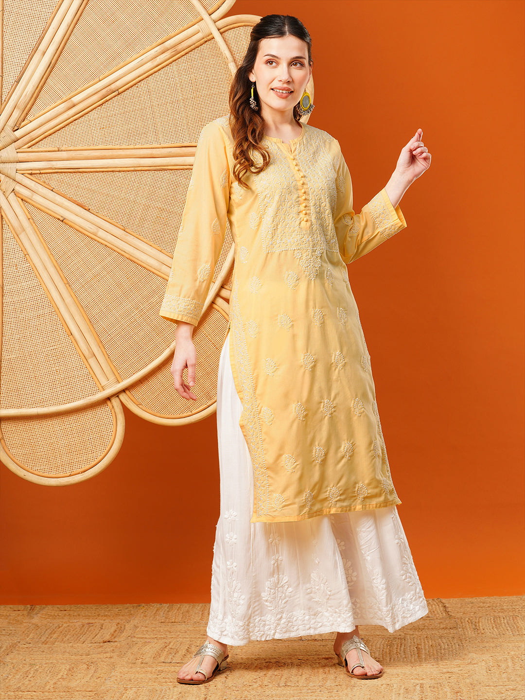 -Print or Pattern Type: Ethnic Motifs -Slit Detail : Side Slits -Weave Pattern: Regular -Weave Type: Machine Weave -Sleeve Length: Three-Quarter Sleeves -Neck: Round Neck -Ornamentation: Chikankari -Shape: Straight -Length: Calf Length -Hemline: Straight -Front Length ( Inches ): 45Material & Care: