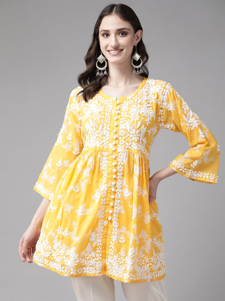 Yellow-&-White-Cotton-Floral-Embroidered-Chikankari-Kurti
