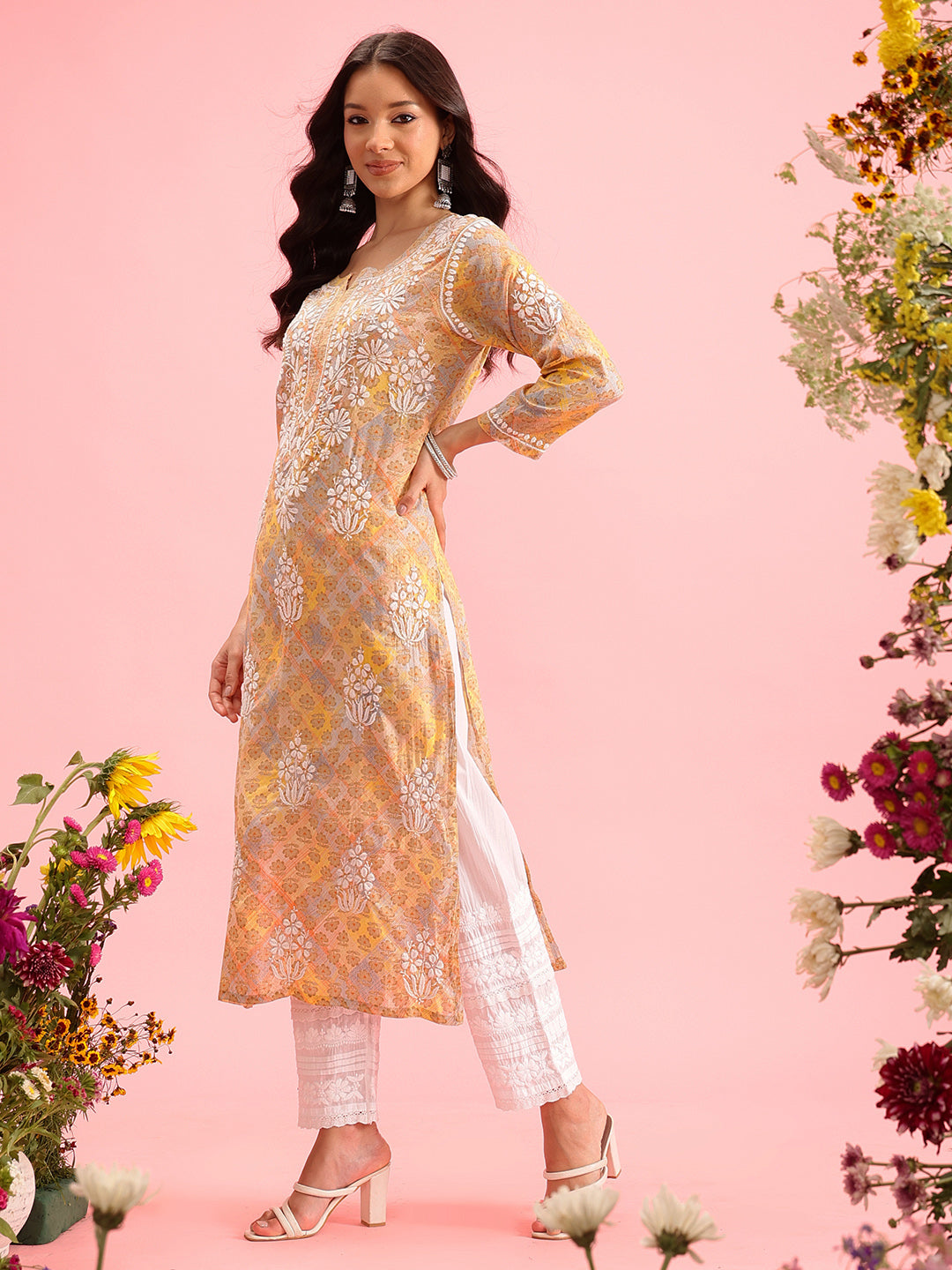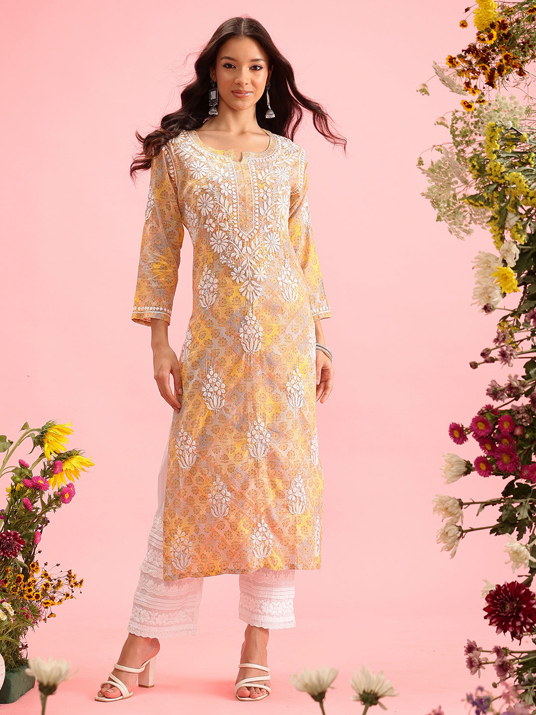 This is a Hand Embroidered Chikankari Yellow & White Mul Cotton Kurta