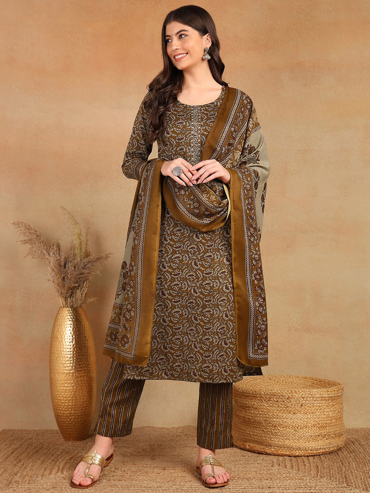 Zeresouq Exclusive Cotton Blend Fabric in this attractive Brown Color ready to wear Kurta Set will make sure that the fitting of this beautiful readymade Kurta Set looks elegant on you. Crafted With Cotton Blend Bottom Fabric, Printed Pattern With Calf Length Straight Round Neck Three-Quarter Sleeves Kurta it is light in weight and will be soft against your skin. Three-Quarter Sleeves Its unique design and beautiful colour will fetch a lot of second glances as you club it with contrast colored pumps and flashy accessory. NOTE: Dupatta length 2.25 mtr and Width 1.0 mtr Front Length ( Inches ): 46