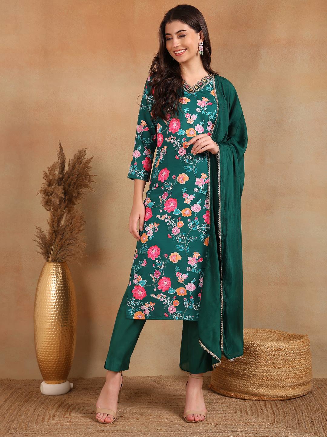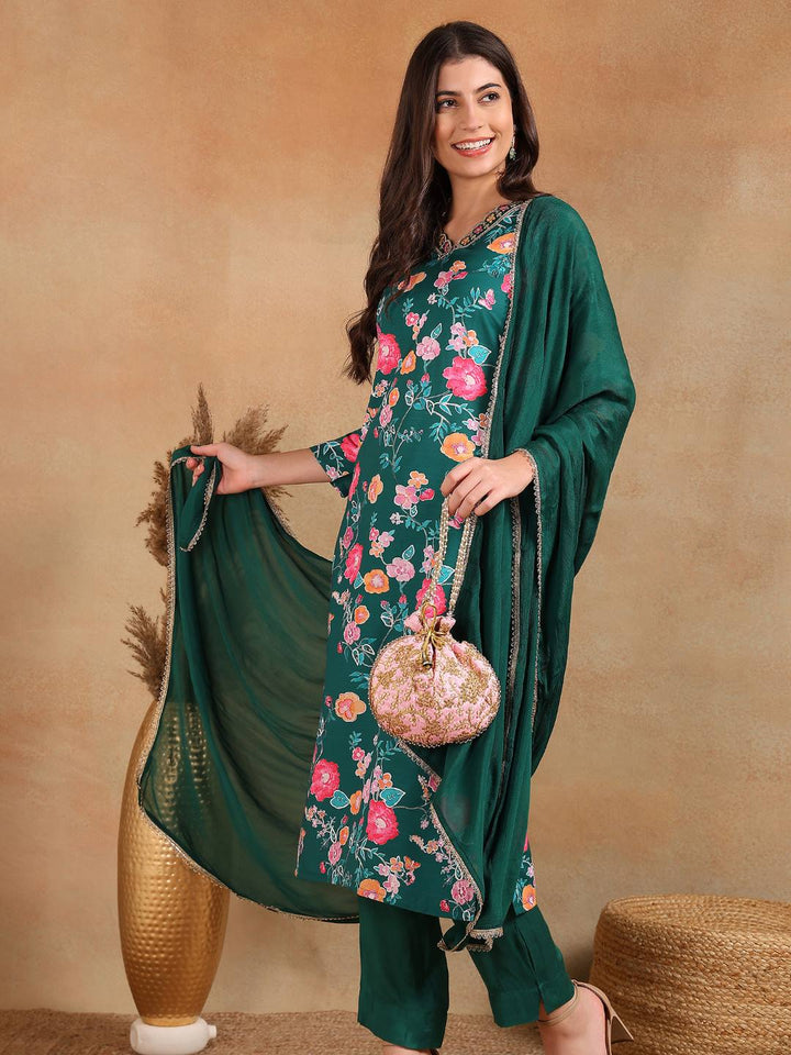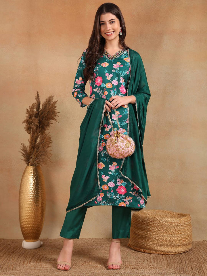 This is a Green Polyester Floral Printed Straight Kurta Trousers With Dupatta