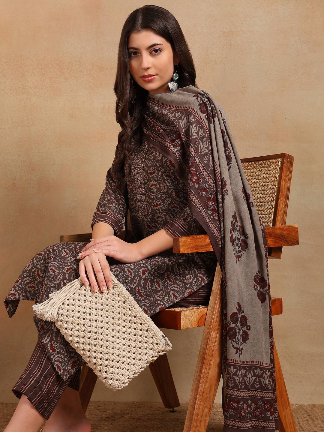 This is a Grey Rayon Blend Ethnic Motifs Printed Straight Kurta Trousers With Dupatta
